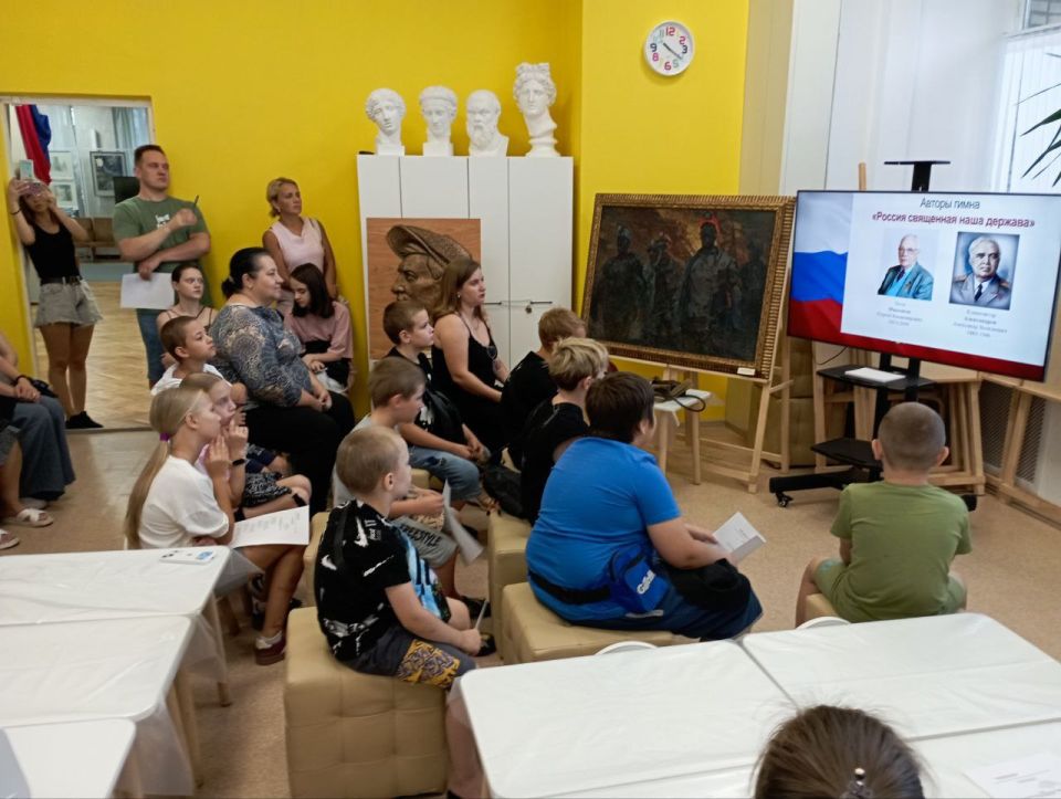 В программе — просмотр ролика о государственной символике, совместное исполнение гимна, творческие мастер-классы: ребята рисовали флаг и готовили элементы флешмоба, который ярко завершил встречу.