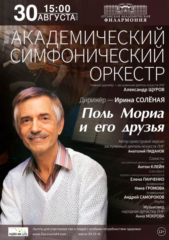 30 августа в 15:00 – на сцене академический симфонический оркестр с программой «Поль Мориа и его друзья». Дирижёр — Ирина Солёная.