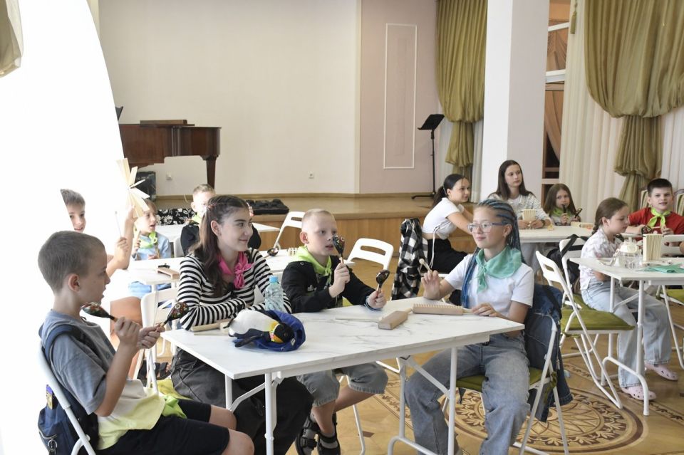 Детям рассказали о связи музыки с мифологией и природой. Они узнали, как такие инструменты, как маракасы и трещотки, имитируют звуки дождя и грома, и как народные умельцы создавали их из подручных материалов.