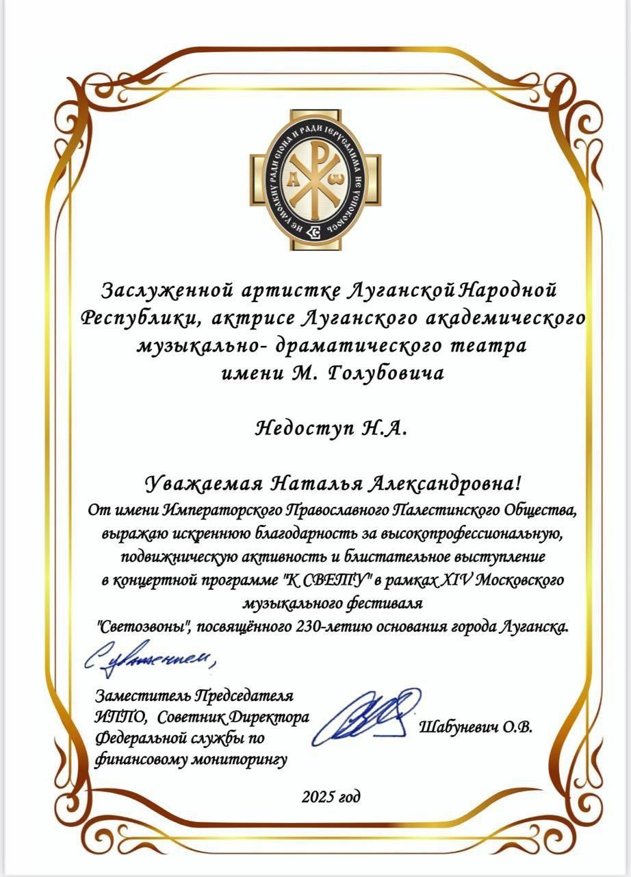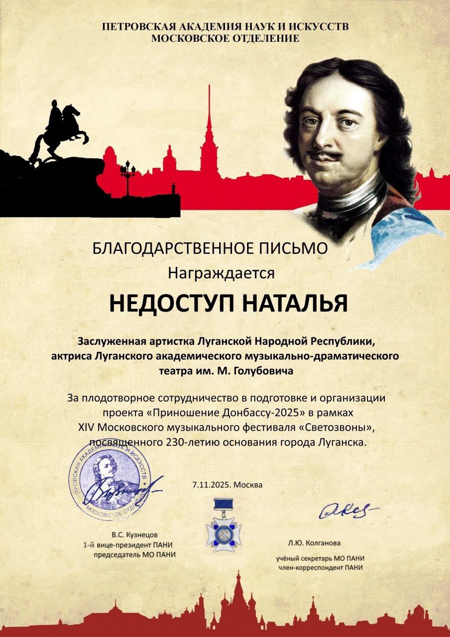 Эта тройная признательность стала оценкой её огромного вклада в подготовку и блестящую организацию масштабного культурного проекта «Приношение Донбассу 2025», который прошёл в рамках XIV Московского музыкального фестиваля «Светозвоны». Особенно символично, что этот фестиваль был посвящён 230-летию со дня основания нашего родного города-труженика, нашего Луганска.