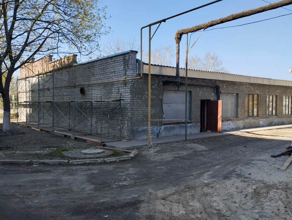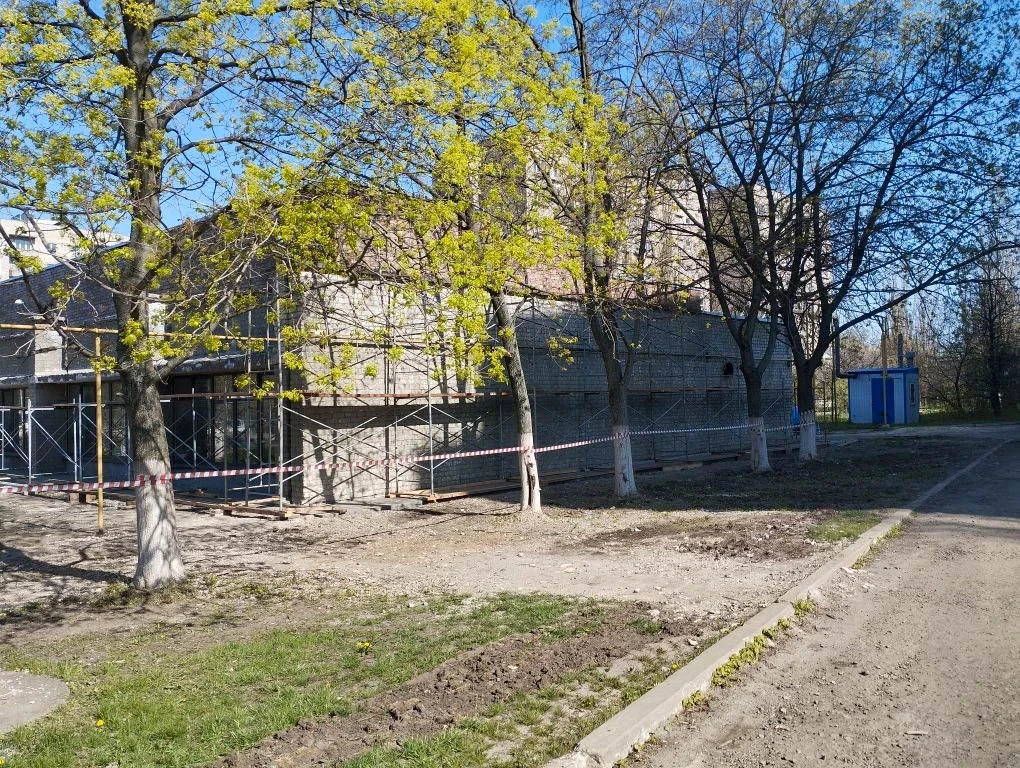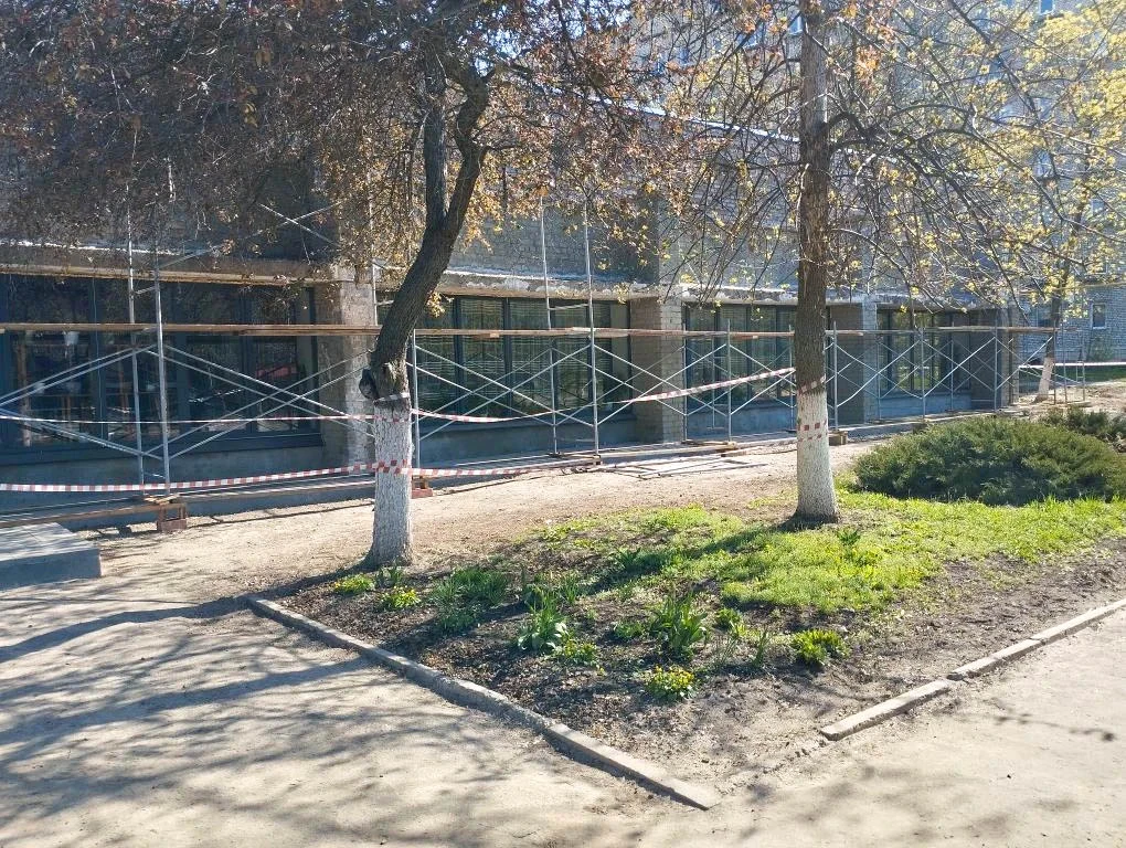 — рабочие устанавливают леса вдоль фасада и стен здания;