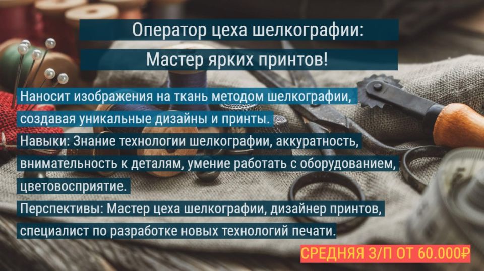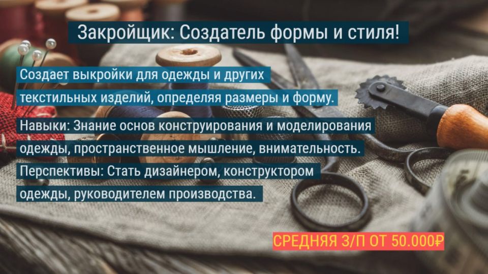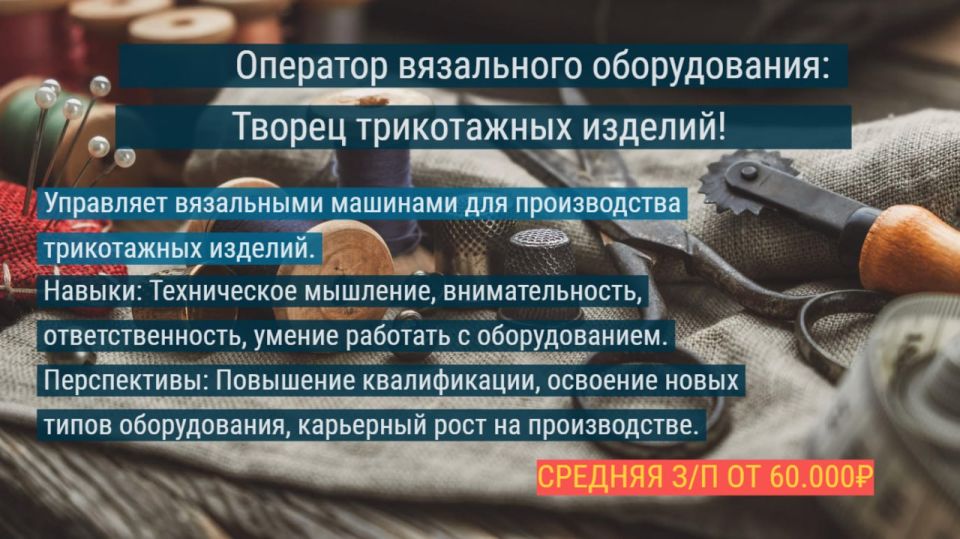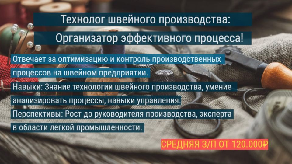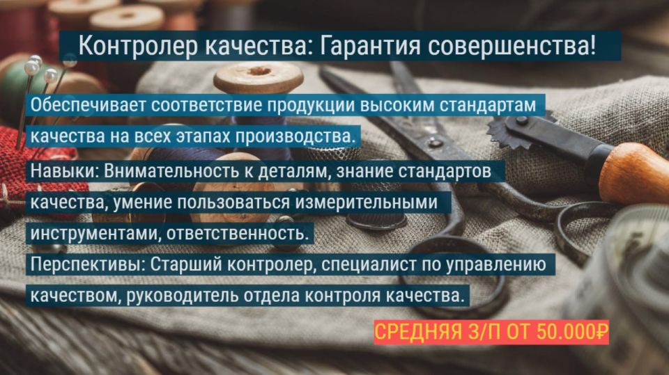 Откройте для себя легкую промышленность ЛНР! Узнайте о самых перспективных и востребованных профессиях отрасли: вакансии, требования, возможности для роста - все это в наших карточках!