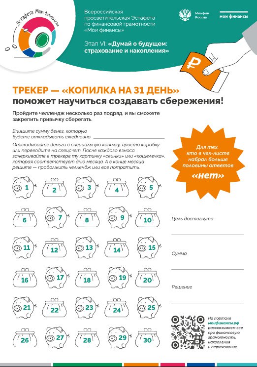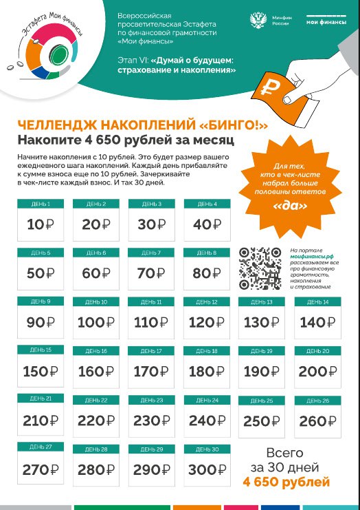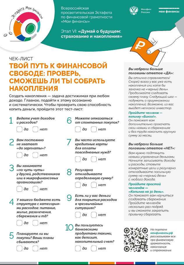 В рамках Всероссийской просветительской Эстафеты по финансовой грамотности "Мои финансы" (Этап VI: "Думай о будущем: страхование и накопления") пройдите чек-лист, чтобы узнать, насколько вы готовы к накоплениям и достижению финансовой свободы!