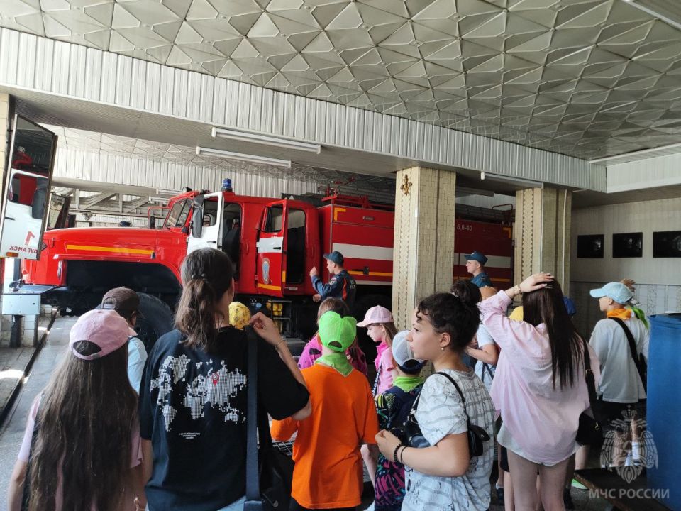 В завершение экскурсии мальчишки и девчонки смогли посидеть в настоящей пожарной машине 1-й пожарно-спасательной части, примерить боевую одежду огнеборцев и почувствовать себя настоящими героями.