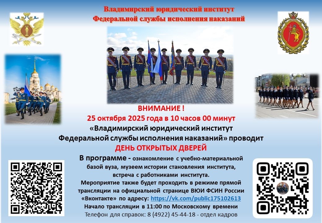 25 октября в 10:00 во Владимирском юридическом институте ФСИН России состоится День открытых дверей.