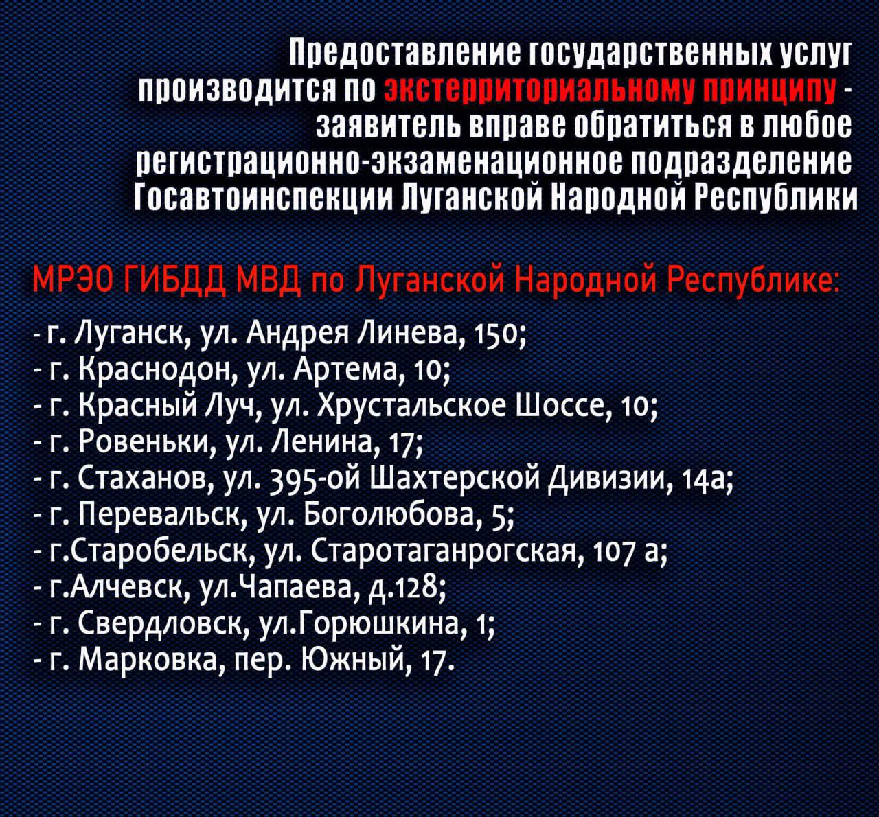 Адреса и телефоны МРЭО ГИБДД по Луганской Народной Республике: