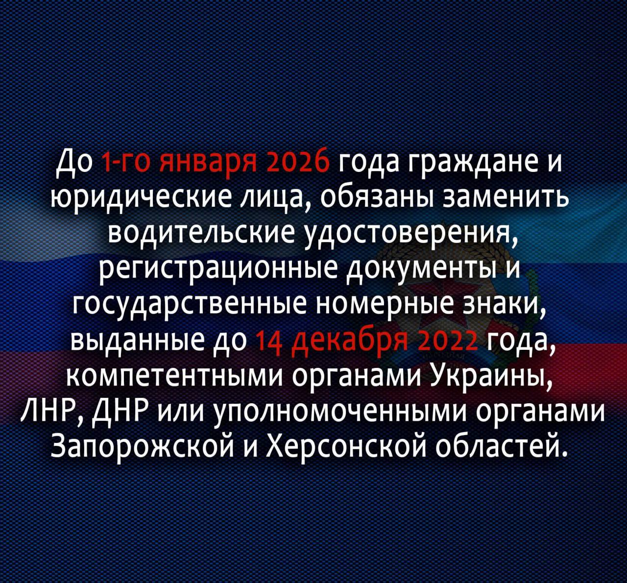 Замена водительских удостоверений, регистрационных документов и номерных знаков будет осуществляться до 01 января 2026 года.
