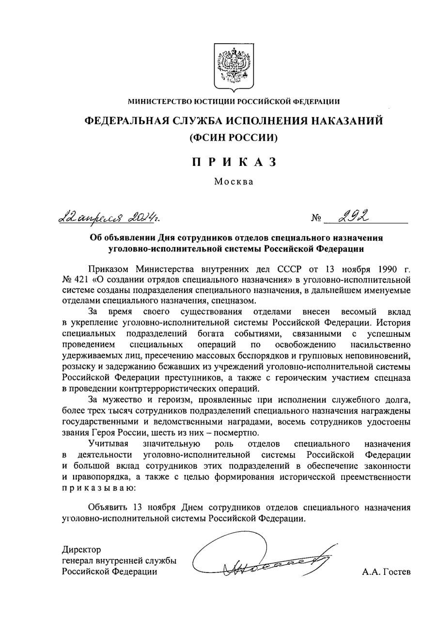 Приказом ФСИН России от 22 апреля 2024 года № 292 13 ноября объявлено Днем сотрудников отделов специального назначения уголовно-исполнительной системы Российской Федерации.