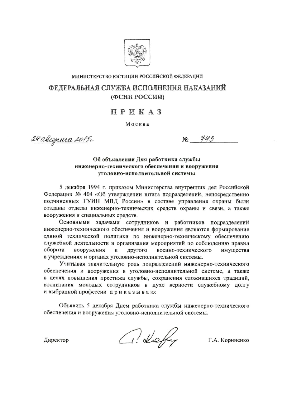 Уважаемые коллеги! Благодаря вашему профессионализму и слаженности действий сотрудников обеспечивается стабильная работоспособность инженерно-технических средств охраны и надзора, сохранность вооружения, боеприпасов, специальных средств, а также организовывается бесперебойная связь в целях оперативного руководства и поддержания установленного порядка отбывания наказаний в учреждениях УИС. В этот знаменательный день примите искренние пожелания мира, добра и благополучия. Пусть в жизни вас сопровождают оптимизм, сила духа и неиссякаемый потенциал в деле укрепления и совершенствования уголовно-исполнительной системы России.
