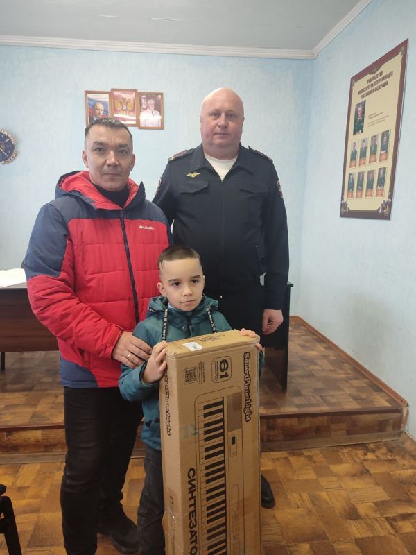 Начальник Отдела МВД России «Беловодский» подполковник полиции Николай Роговой вручил электронный синтезатор юному жителю Беловодска Егору. Своей мечтой мальчик поделился в рамках благотворительной акции «Ёлка желаний», а шар с загаданным снял с ёлки правоохранитель.