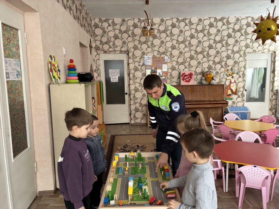 Инспектор на макете доступно объяснил малышам, как правильно переходить дорогу, где можно играть, а где — категорически нельзя. Ребята слушали, задавали вопросы и учили ПДД.