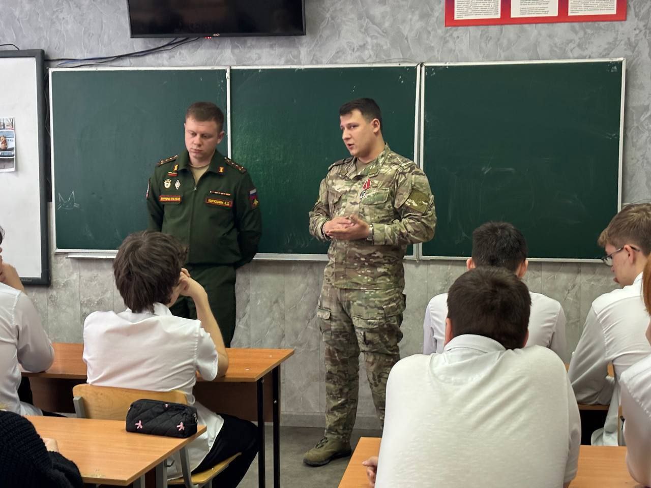 Кроме того, для обучающихся в профильном полицейском классе юношей и девушек военнослужащие провели урок мужества, на котором рассказали о выборе данной профессии, о службе на благо страны и о героических поступках участвующих в специальной военной операции коллег.