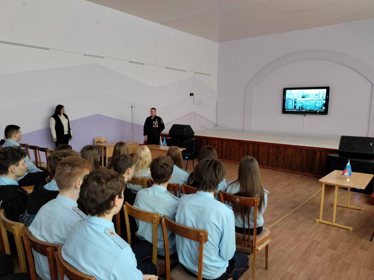 С учащимися юридического класса и старшеклассниками Ровеньковской школы № 3 имени Александра Бурды встретился участник СВО и действующий сотрудник Отдела МВД России «Ровеньковский» – командир отделения по обеспечению мер безопасности и антитеррористической защищённости объектов органов внутренних дел прапорщик полиции Вячеслав Квитко. Правоохранитель провёл для школьников Урок мужества, основная цель которого – патриотическое воспитание молодёжи и повышение престижа службы в органах внутренних дел.