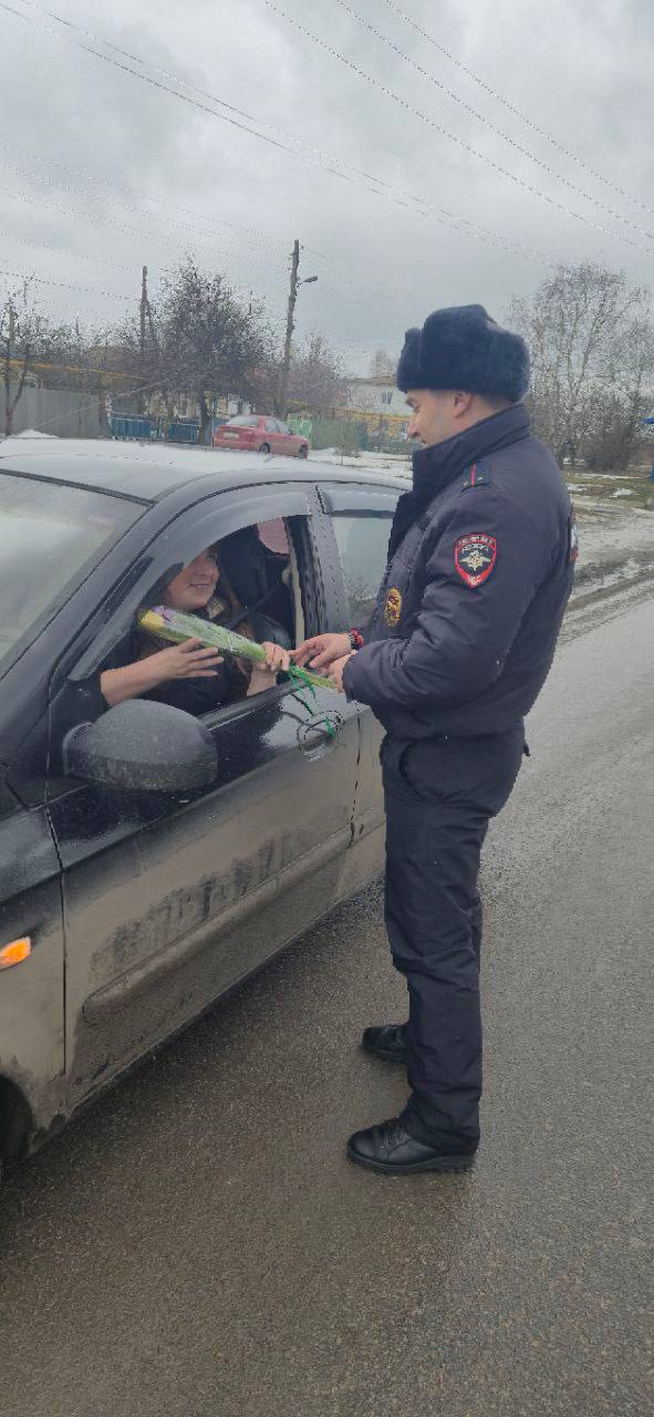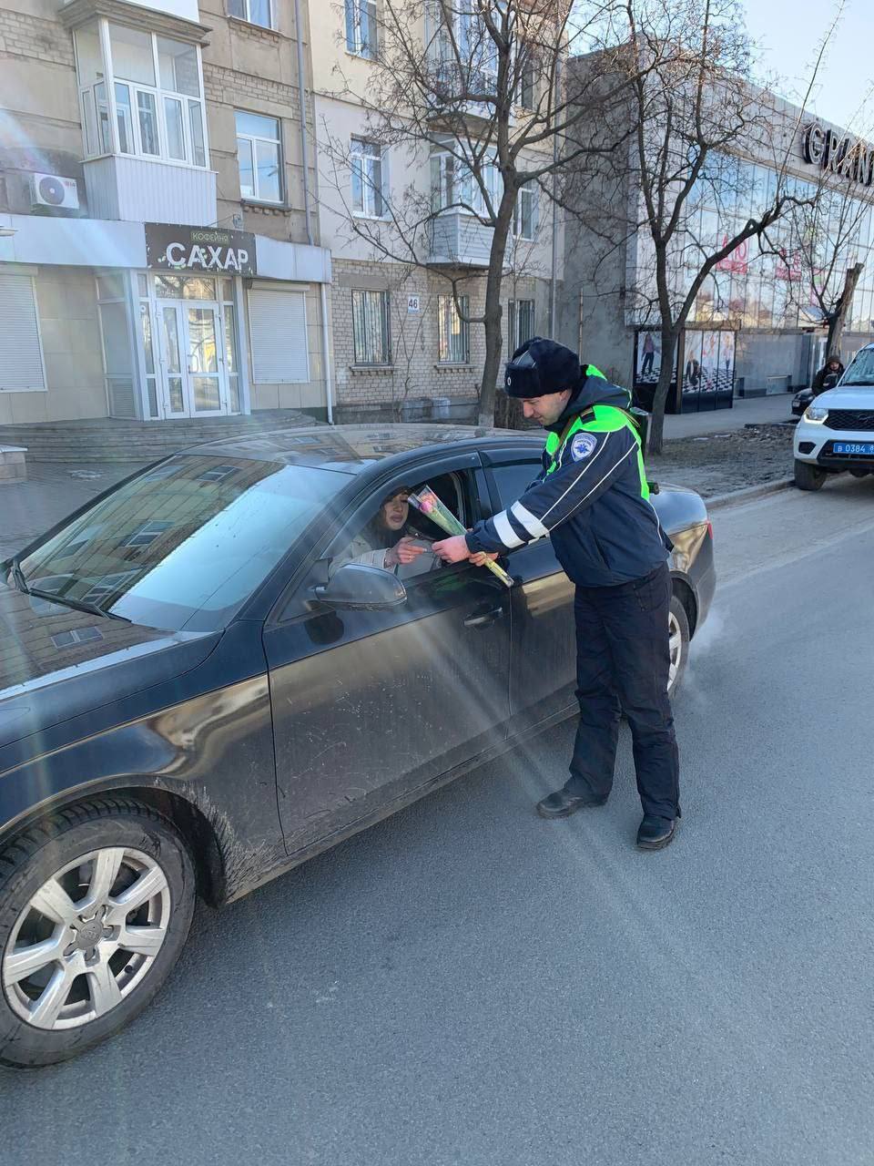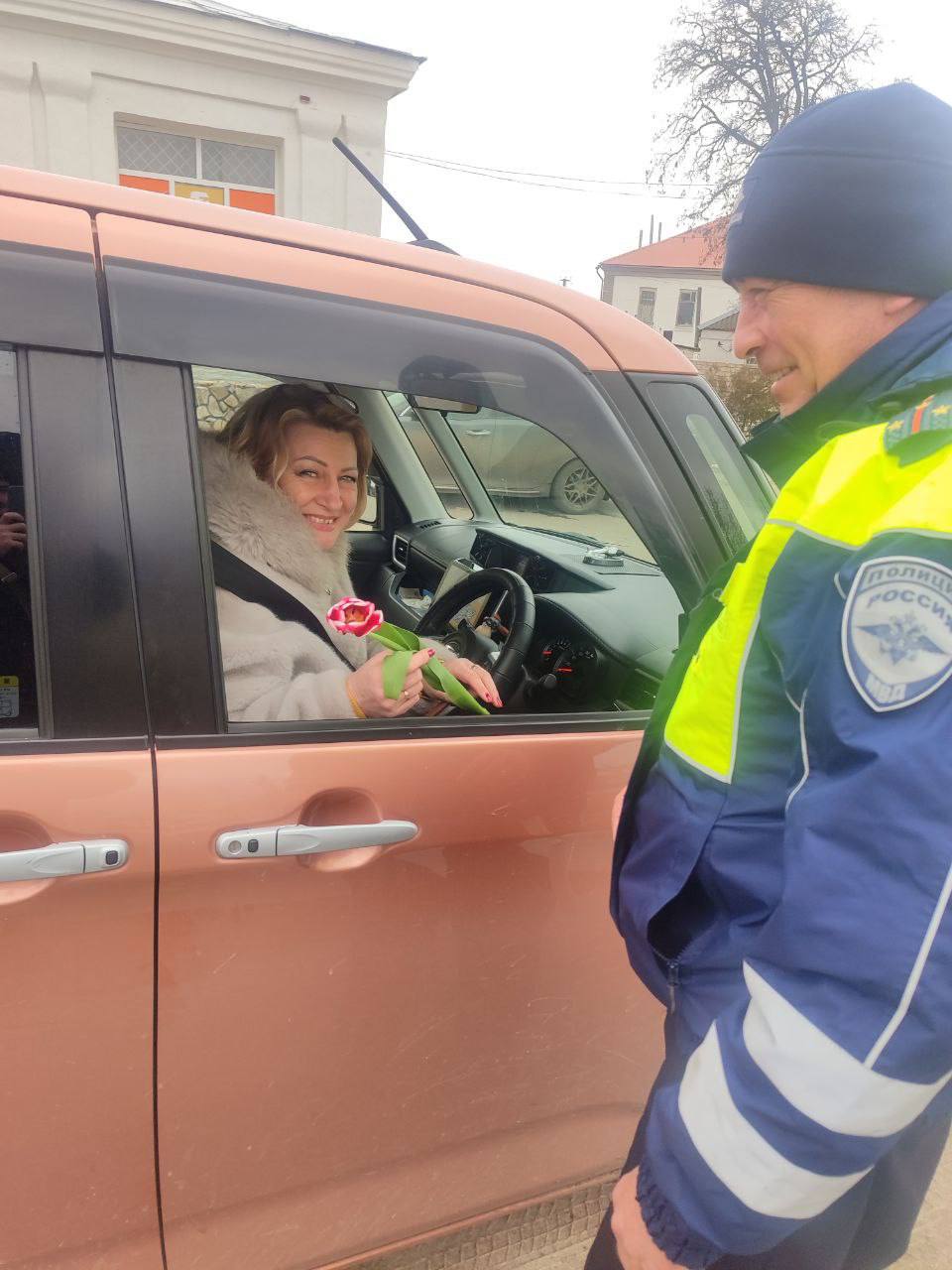 Дорожные полицейские вручают дамам цветы, выражают тёплые пожелания и советы по безопасности дорожного движения.