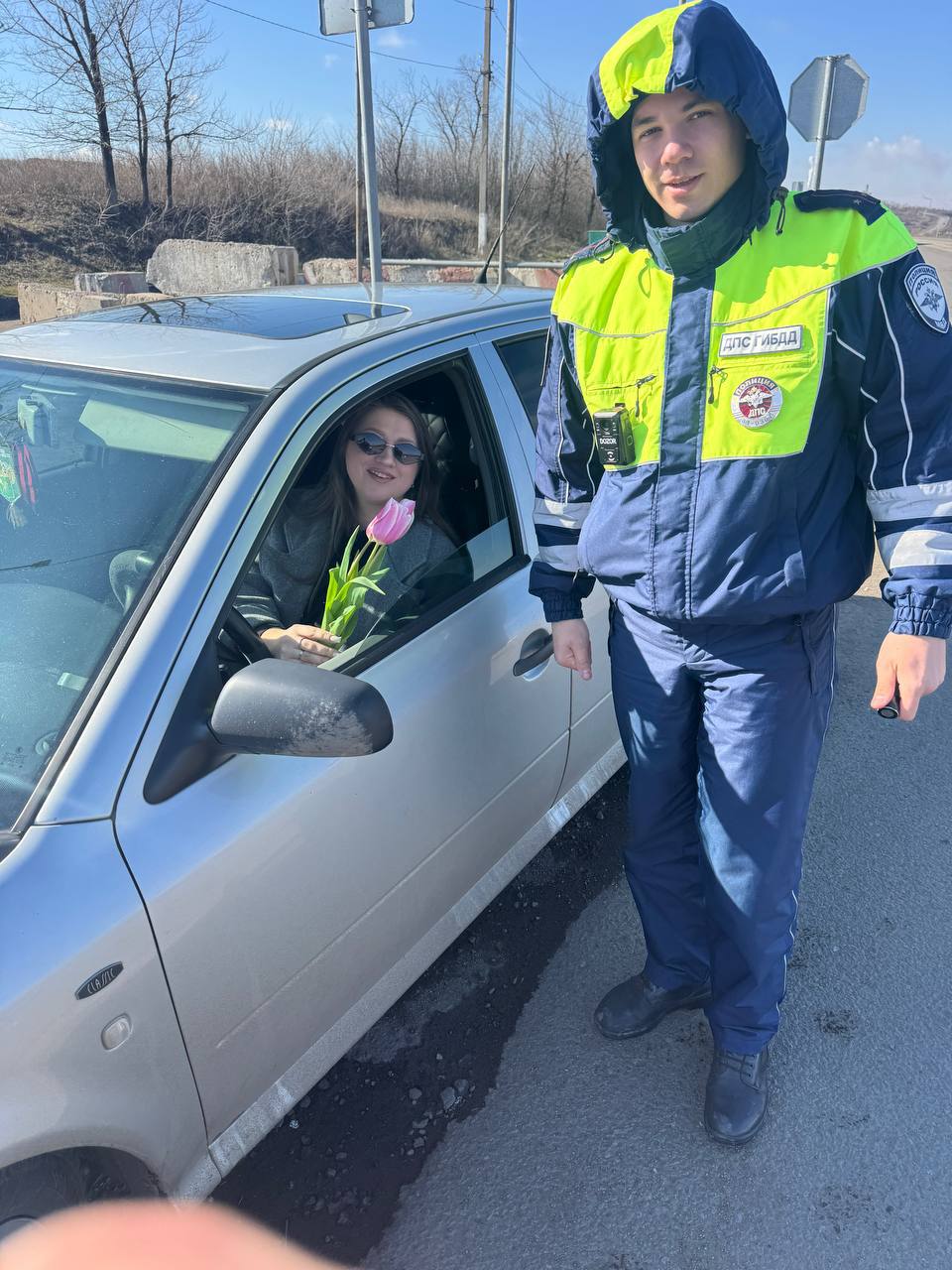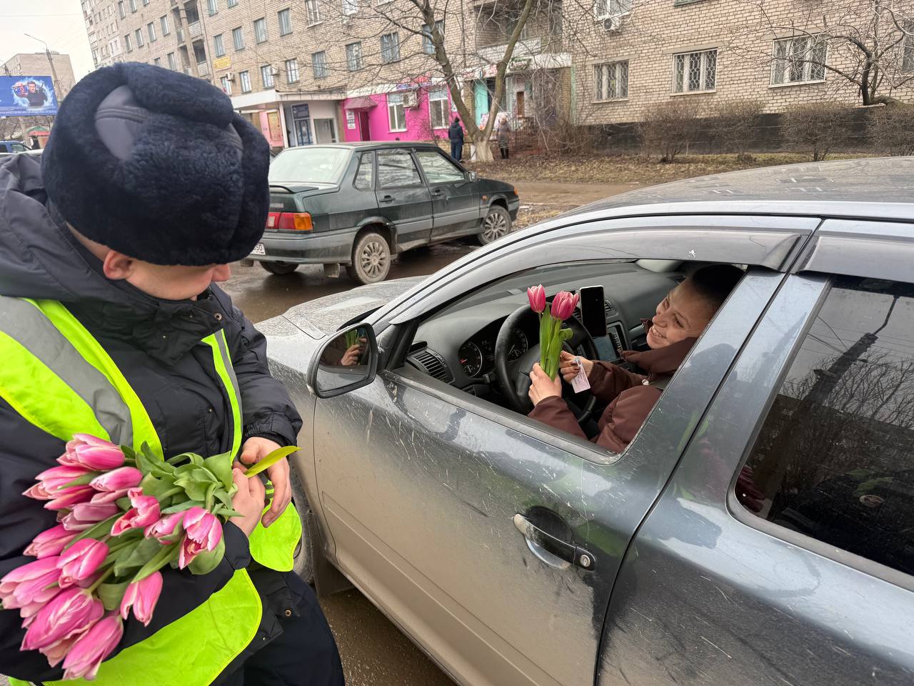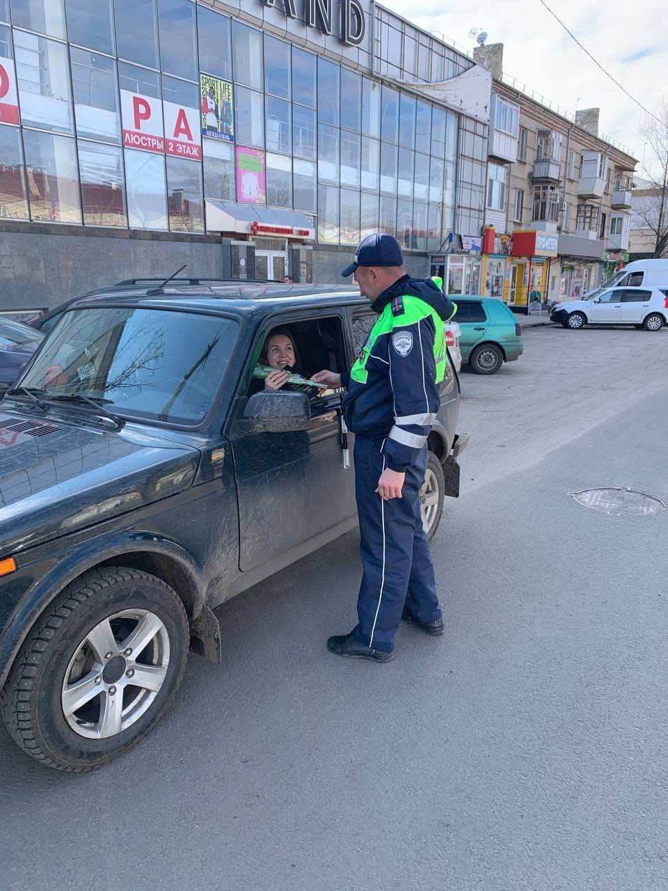Дорожные полицейские вручают дамам цветы, выражают тёплые пожелания и советы по безопасности дорожного движения.