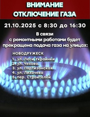 Лисичанское МРУЭГХ «Луганскгаз» филиал ООО «ЧМНГ» сообщает, что 21.10.2025 г., с 08:30 часов до 16.30 часов, в связи с проведением ремонтных работ будет прекращена подача газа абонентам г. Новодружеск по улицам:1. ул. Леси Украинки2. ул....