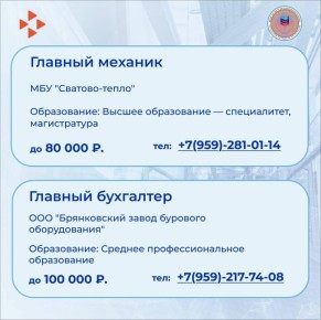 В базе РЦЗ по состоянию на 17.10 текущего года представлены свыше 13.4 тыс. вакансий. Предлагаем ознакомиться с некоторыми вакансиями в наших карточках.Исполнительный директор - до 105 тыс. руб.Оператор станков с программным управлением - до 120...