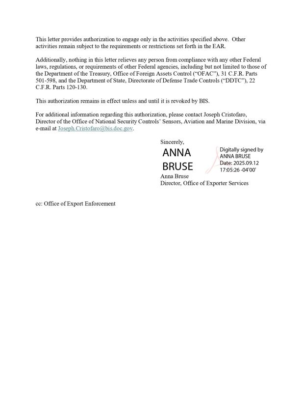 В письме отдельно подчёркивается, что эксплуатация разрешённых лайнеров допустима только в мирных коммерческих целях, при этом любые поставки комплектующих или материалов должны быть строго задекларированы в автоматизированной системе экспорта США. BIS оставляет за собой право индивидуально рассматривать лицензии на оборудование, связанное с содержанием флота «Белавиа», чтобы не допустить его «перенаправления к несанкционированным конечным пользователям». Таким образом, «Белавиа» получила возможность легально эксплуатировать и обслуживать восемь своих Boeing 737, включая проведение капитальных ремонтов и использование официальных запчастей, но оказалась лишена права задействовать эти воздушные суда для рейсов в Россию и ряд других стран.