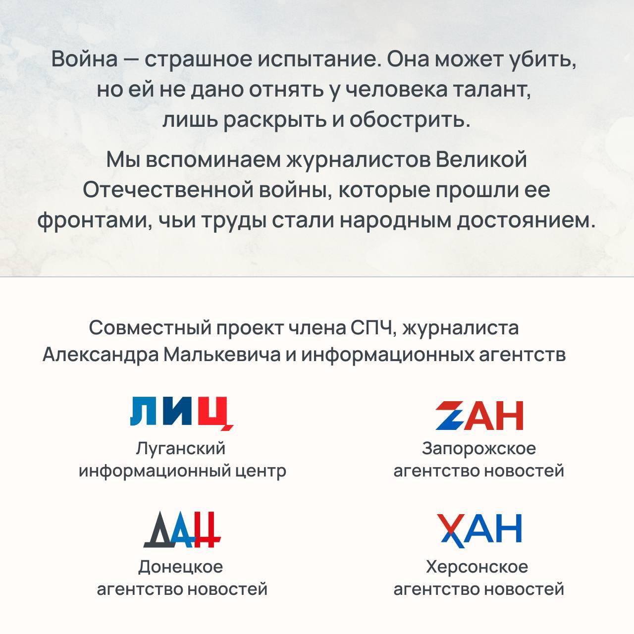ЛуганскИнформЦентр и член СПЧ Александр Малькевич представляют цикл рассказов о журналистах, ставших хроникерами Великой Отечественной войны.