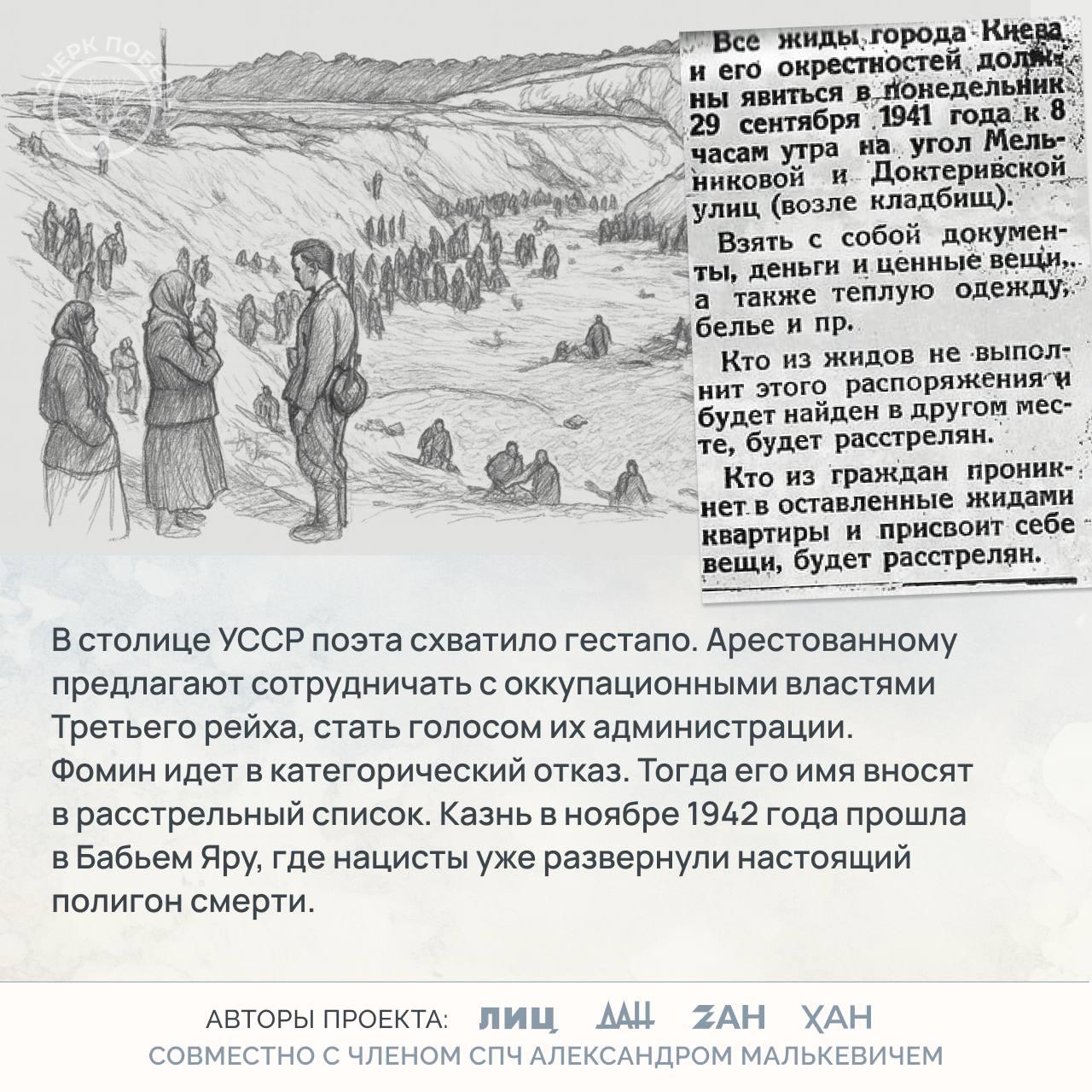 После начала Войны Фомина с семьей перевозят в Уфу. Но уже в начале 1942 года он добровольцем уходит на фронт, записывают в военкоры. Писатель попадет в окружение в Донбассе, прорвется в оккупированный Киев, где его схватит гестапо. Фомину предлагают стать «голосом» немецкой администрации, а за категорический отказ его имя вносят в расстрелянный список. Его жизнь оборвет выстрел на полигоне смерти в Бабьем Яру.