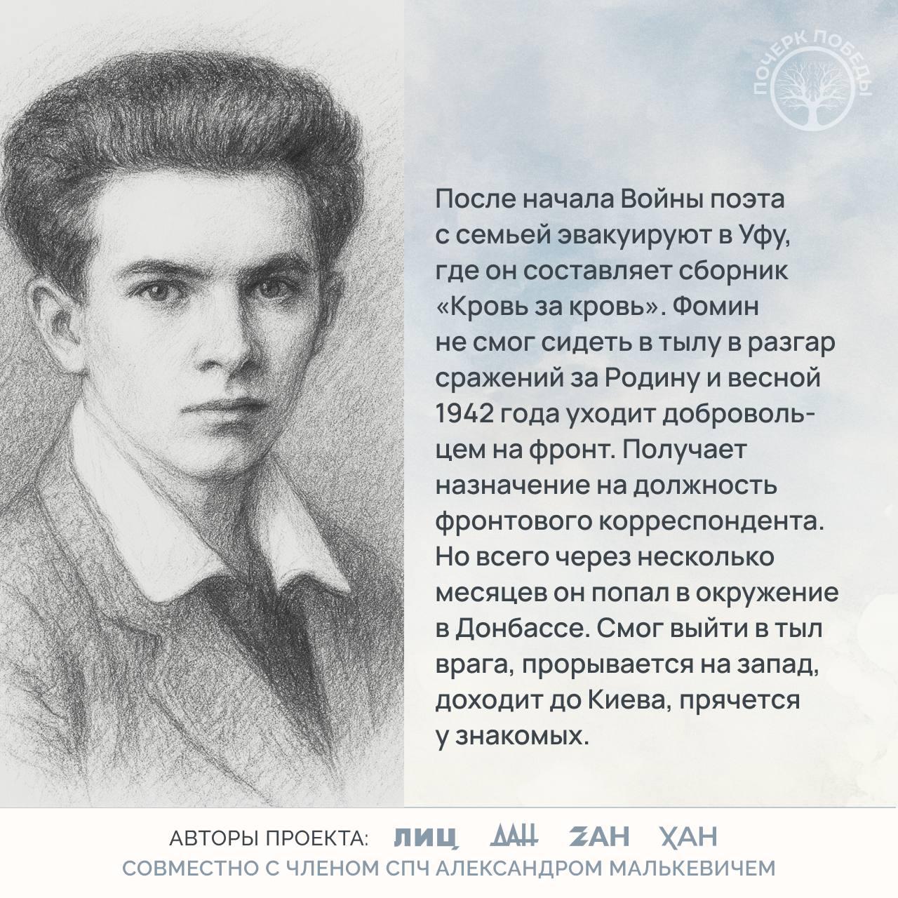 В 16-й главе мы расскажем про Евгения Фомина. Он родился в 1910 году в Каховке, но в раннем возрасте остался сиротой. Строки «На смерть Есенина», прочитанные на вечере памяти поэта в 1926 году, сорвали овации и открыли ему дорогу в литературу. В середине 1930-х он переезжает в Киев, стихи выпускает уже сборниками.