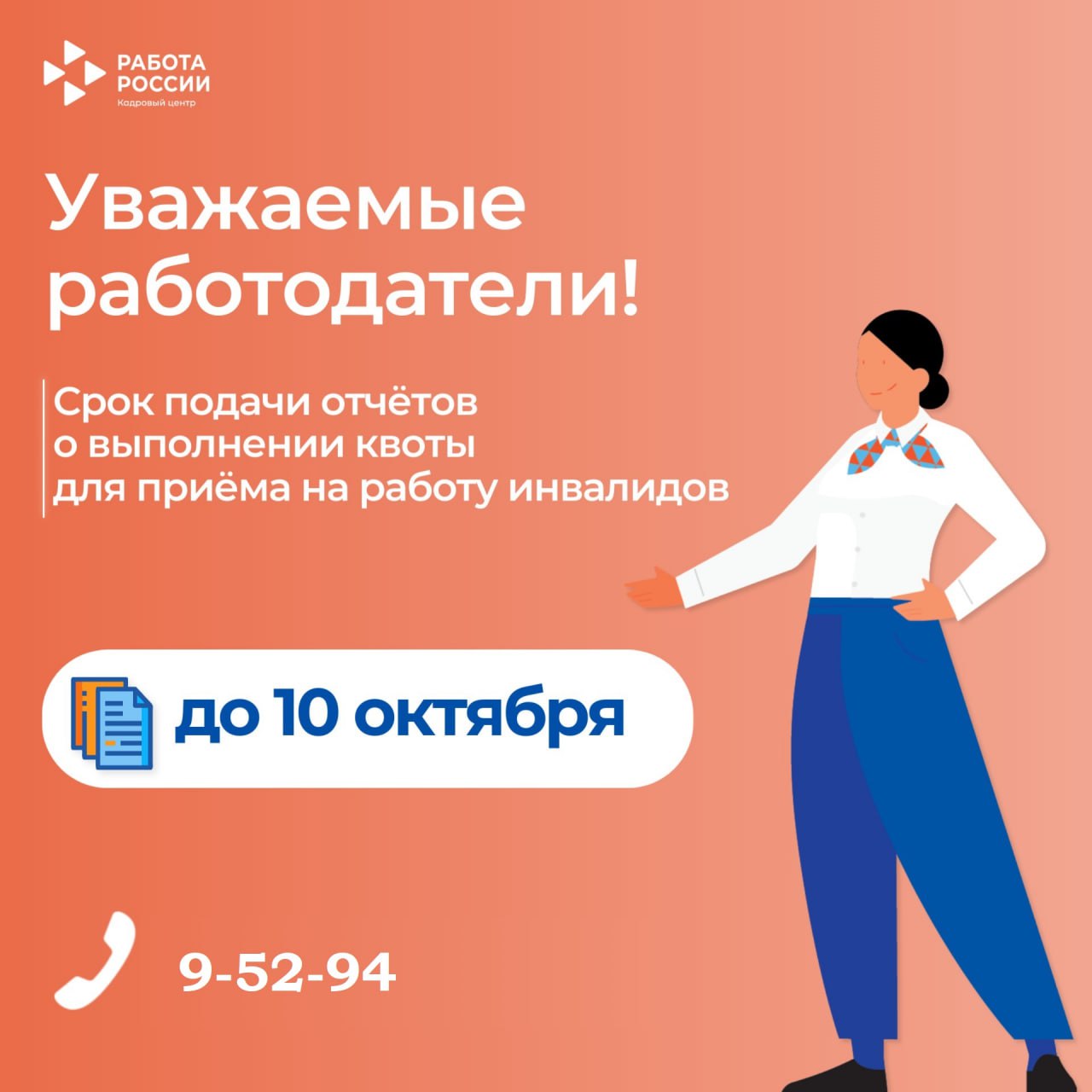 Уважаемые работодатели!. Напоминаем вам, что отчеты о выполнении квоты для приема на работу инвалидов необходимо подать до 10 октября включительно!