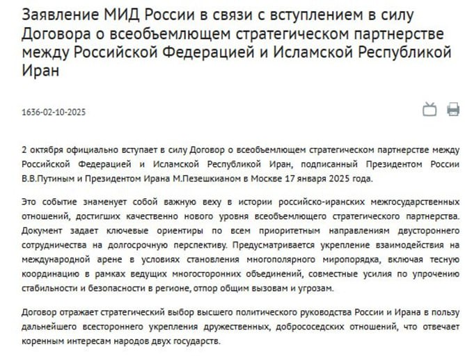 Сегодня вступил в силу Договор о всеобъемлющем стратегическом партнёрстве между Российской Федерацией и Исламской Республикой Иран. Он был подписан 17 января этого года президентами Владимиром Путиным и Масудом Пезешкианом на встрече в Москве.