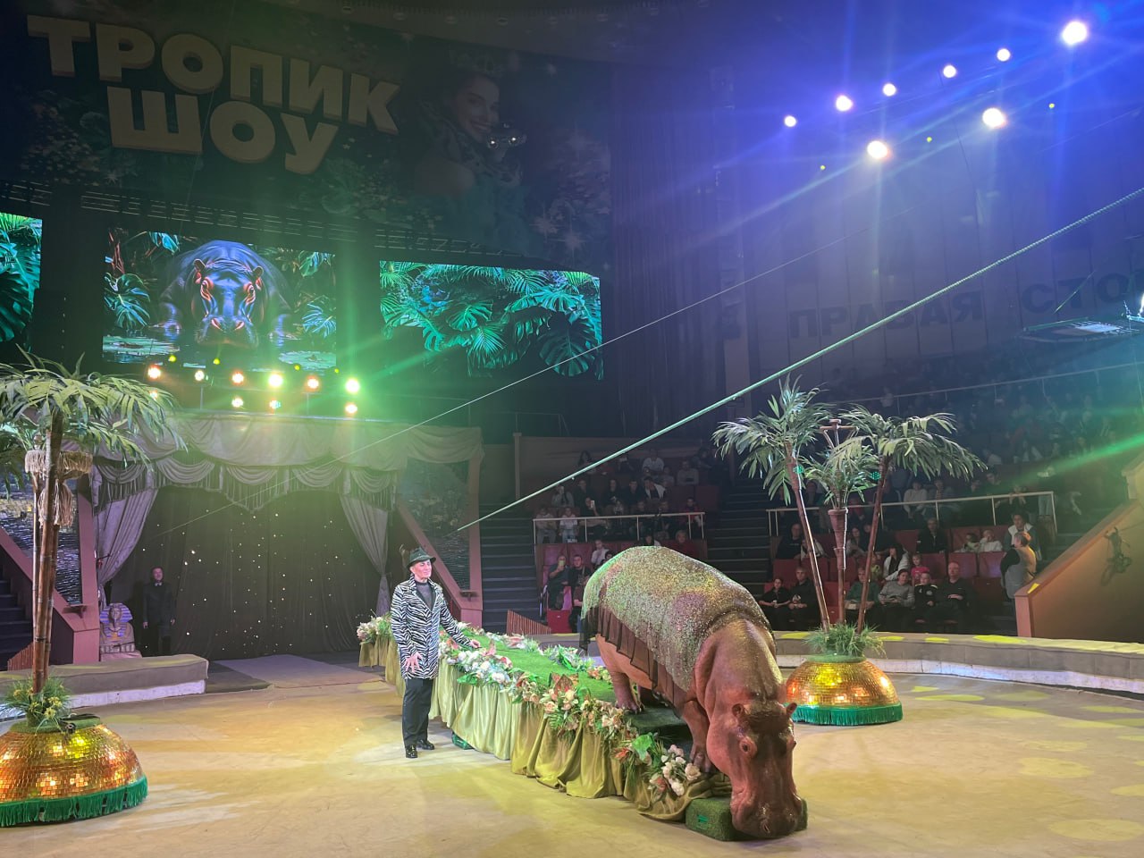 В программе выступали акробаты, эквилибристы, специалисты по контактной дрессуре и более 50 животных: верблюды, дикобразы, еноты, крокодилы, ламы, лошади, обезьяны, собаки и удавы. Особенно зрителям запомнилась главная звезда манежа — легендарный бегемот Юлиана.