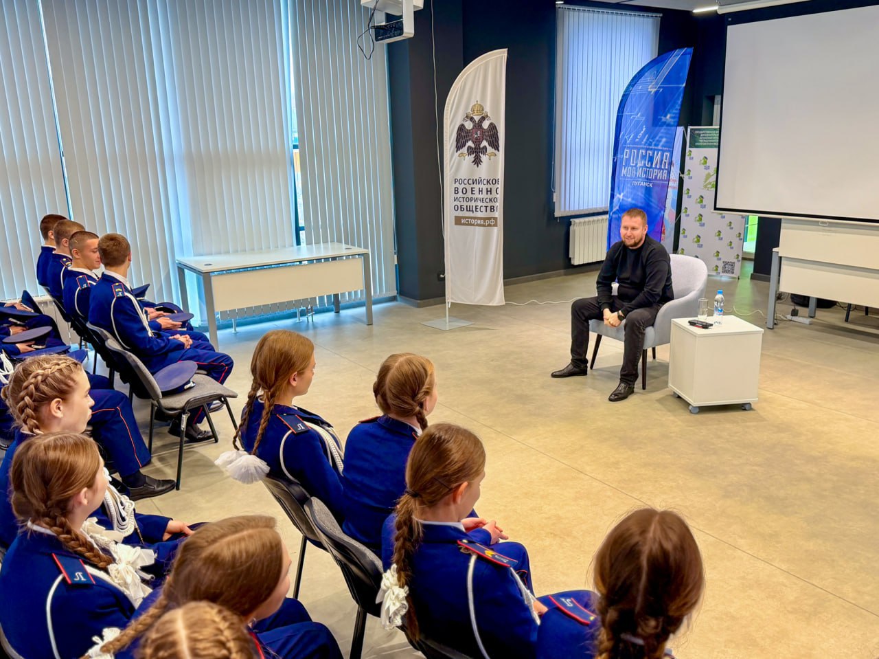 На базе мультимедийного исторического парка «Россия — Моя история» в Луганске спикер парламента встретился с учащимися класса Российского военно-исторического общества Луганского экономико-правового лицея-интерната имени героев «Молодой гвардии». Собравшиеся обсудили важность понимания современных исторических процессов и необходимость труда на благо Родины.