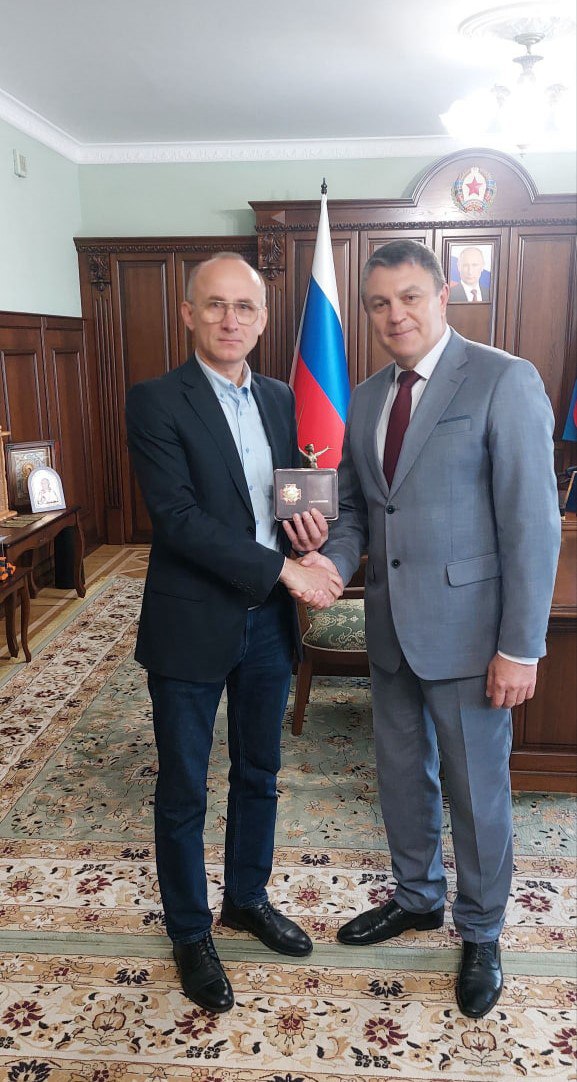 Глава Луганской Народной Республики Леонид Иванович Пасечник вручил государственную награду ЛНР, знак "За гуманитарную помощь", председателю регионального отделения РВИО в Алтайском крае, помощнику Губернатора Алтайского края Юрию Геннадьевичу Проскурину за активную гражданскую позицию и оказание значительной помощи военнослужащим.