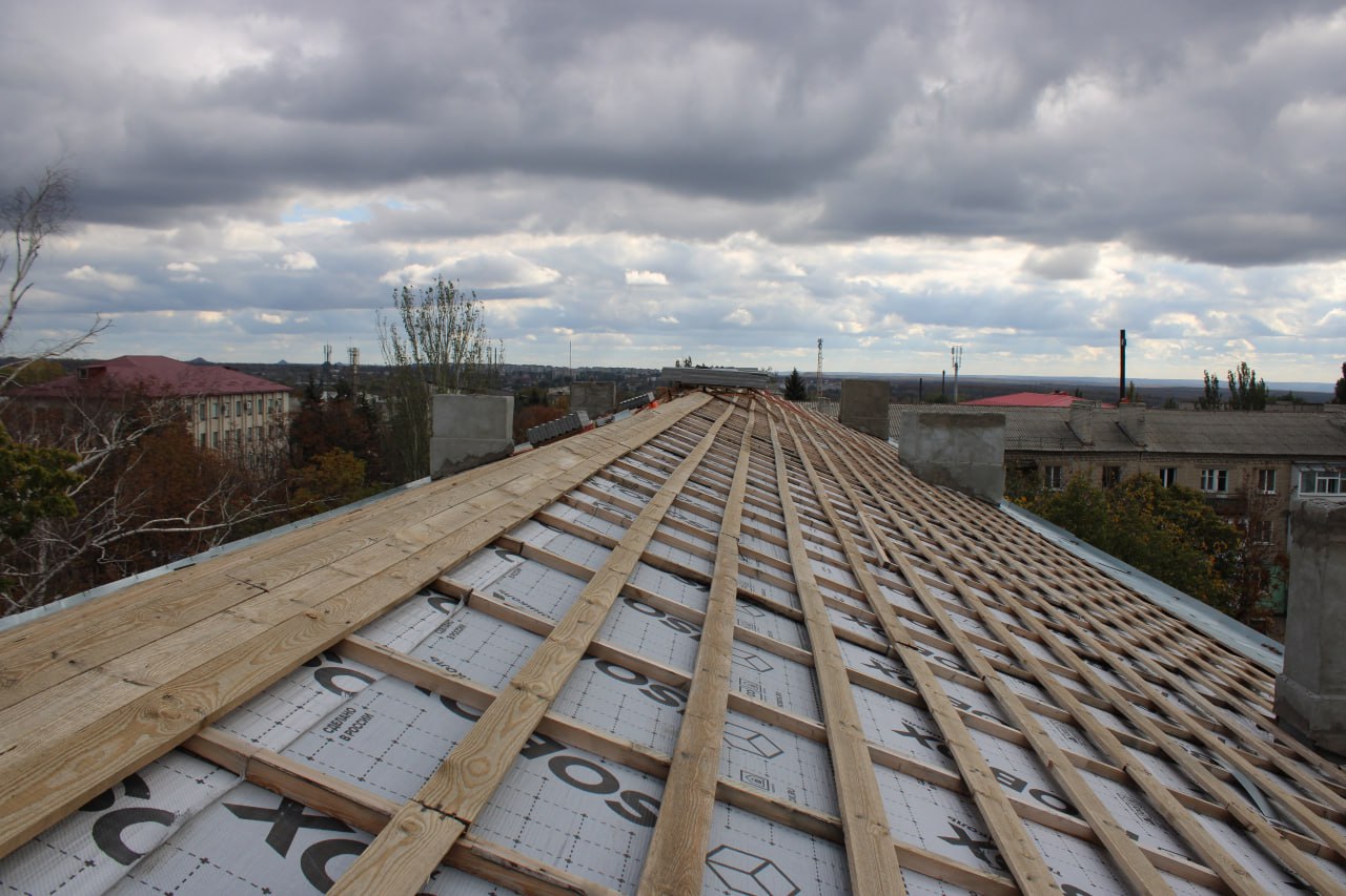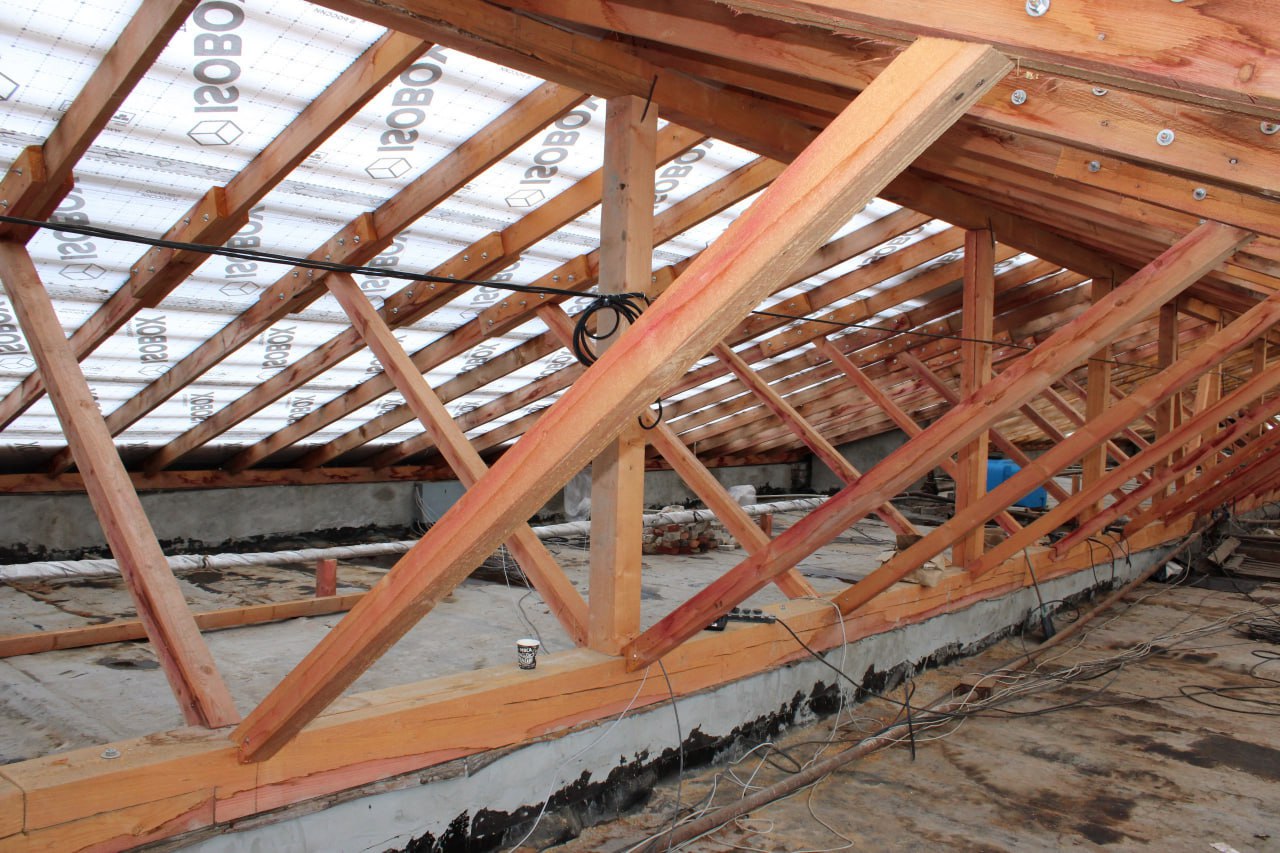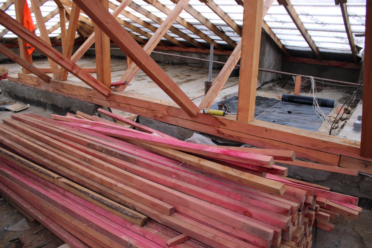 На сегодняшний день работы ведутся в доме №44 по ул. Ленина. Подрядной организацией "Евростой - С" осуществлена замена стропильной системы, укладка новой обрешетки из досок и гидроизоляционной пленки.