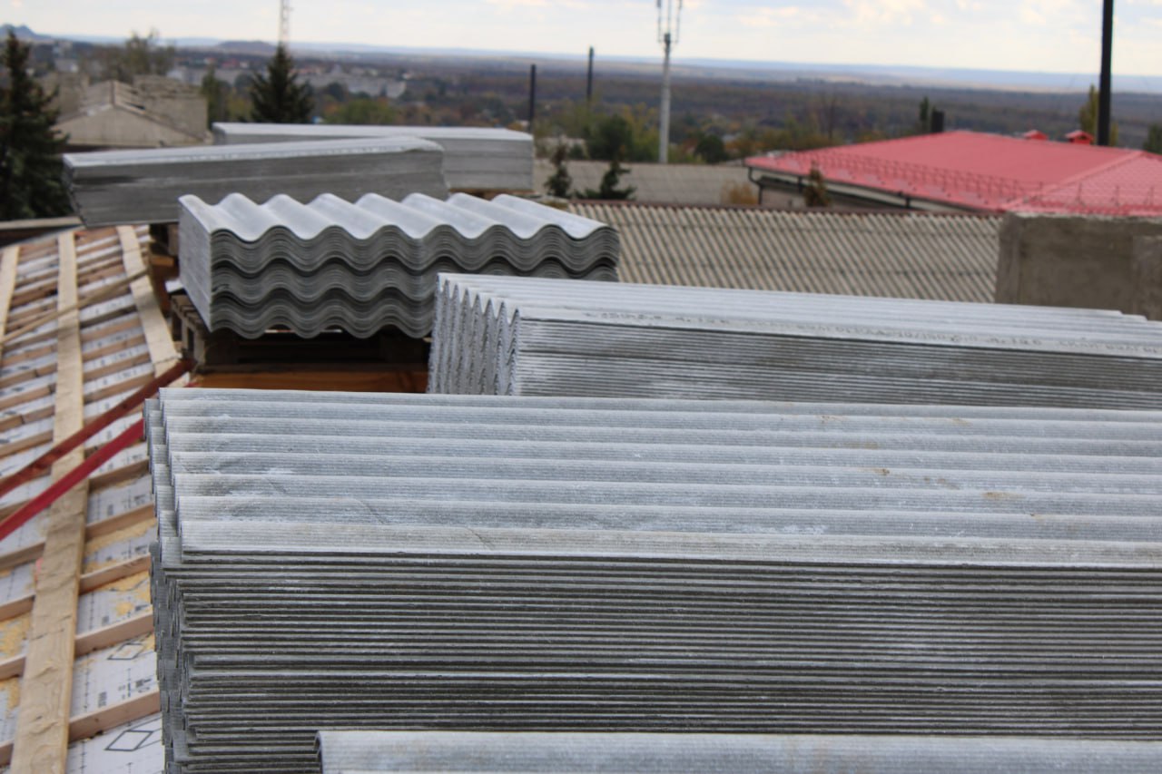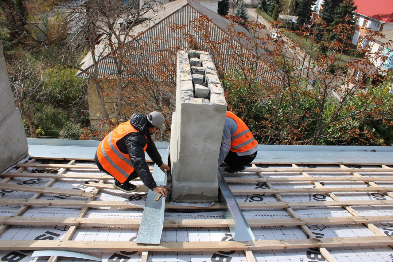 Ведутся работы по устройству оцинкованных примыканий дымовых вентиляционных каналов, после завершения которых будет осуществлен монтаж шиферной кровли и системы ливневого водоотведения.