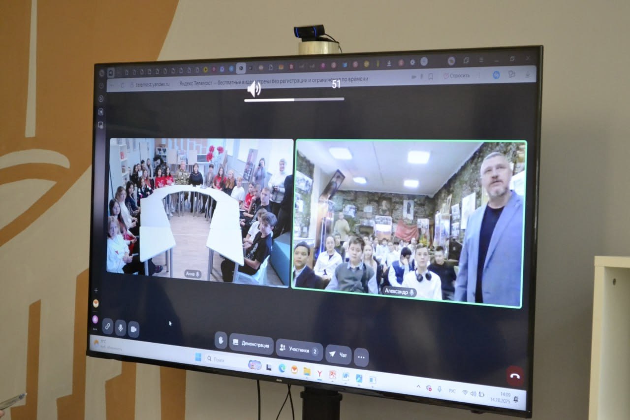 В ходе реализации проекта "Марафон "История Великой Победы" посредством телемоста, школьники рассказали друг другу о своих школах и музеях.