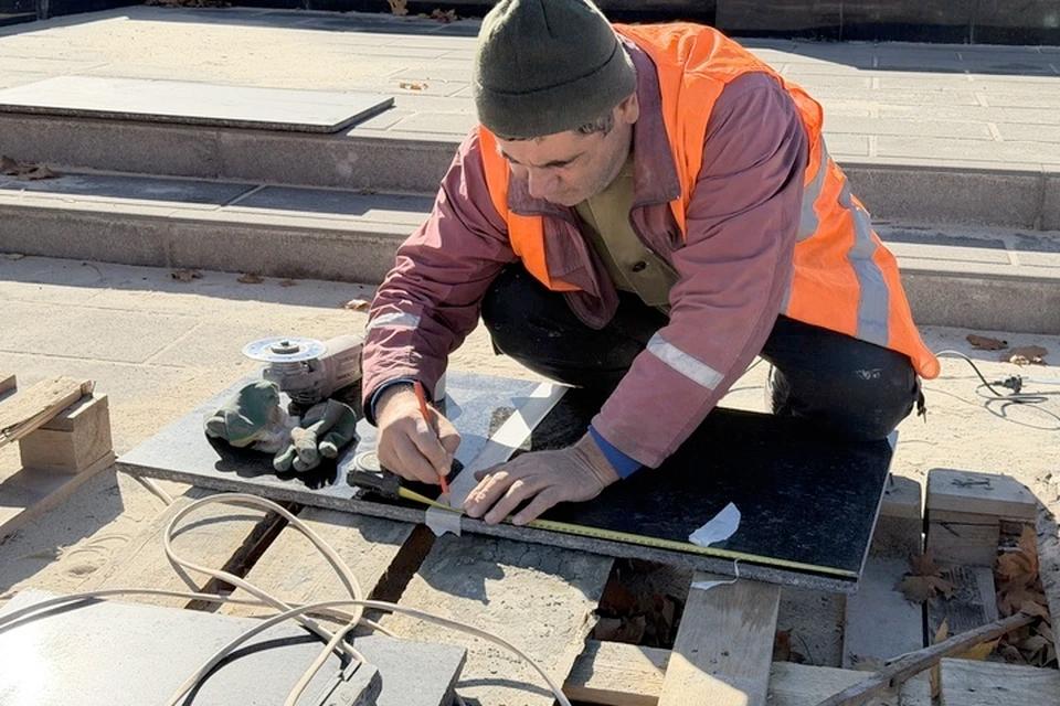 Уже практически завершена реконструкция основания памятника, выполнены работы по выравниванию поверхности площадки, включая ландшафтные зоны и соседние участки, а также уложено покрытие из тротуарной плитки вокруг всей площади. Остаётся выполнить монтаж фонарей и флагштоков.