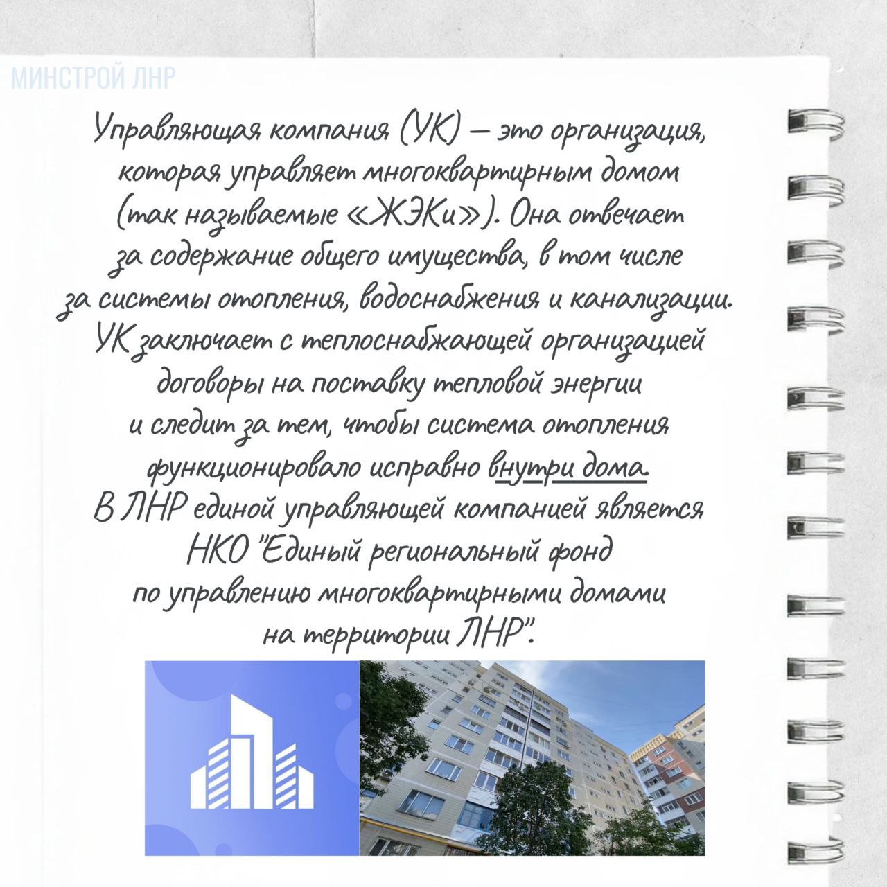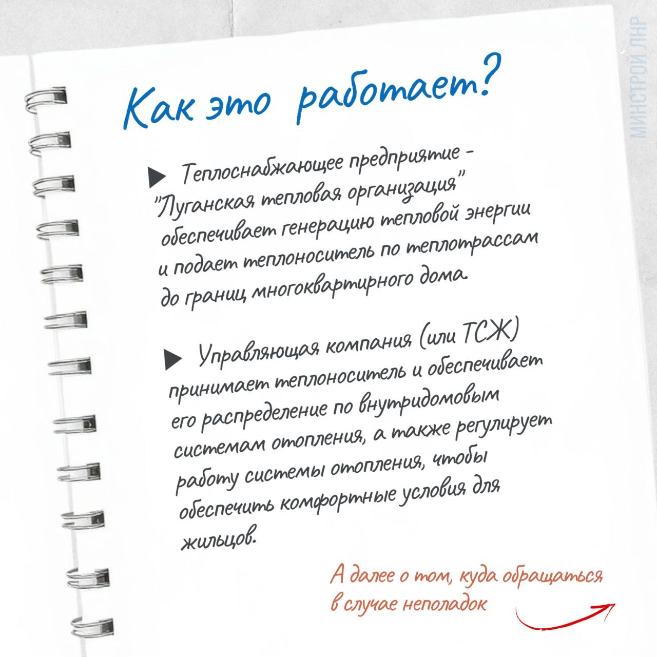 Теплоснабжающее предприятие генерирует тепловую энергию и подает теплоноситель по теплотрассам до границ многоквартирного дома.Управляющая компания (или ТСЖ) принимает теплоноситель и распределяет его по внутридомовым системам отопления.