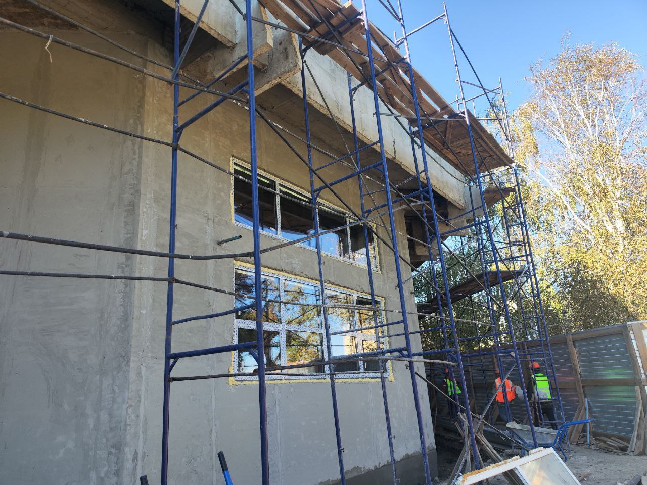 Специалисты компании «СТИЛЛ» продолжают работать в Краснодонском ЗАГСе. Сегодня идёт остекление (70% окон уже установлены), монтируется отмостка, строители «варят» теплотрассу, застилают кровлю.