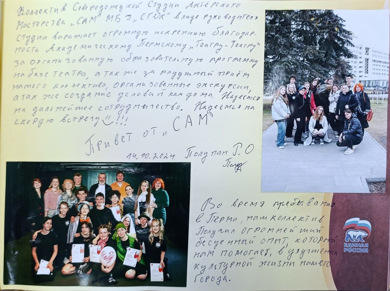 "Коллектив Северодонецкой Студии Актерского мастерства "САМ" Северодонецкого МБУ "СГДК" в лице руководителя студии выражает огромную искреннюю благодарность Академическому Пермскому "Театру-театру" за организованную образовательную программу на базе театра, а также за радушный прием нашего коллектива, организованные экскурсии, а также создание условий как дома. Надеемся на дальнейшее сотрудничество. Надеемся на скорую встречу!".