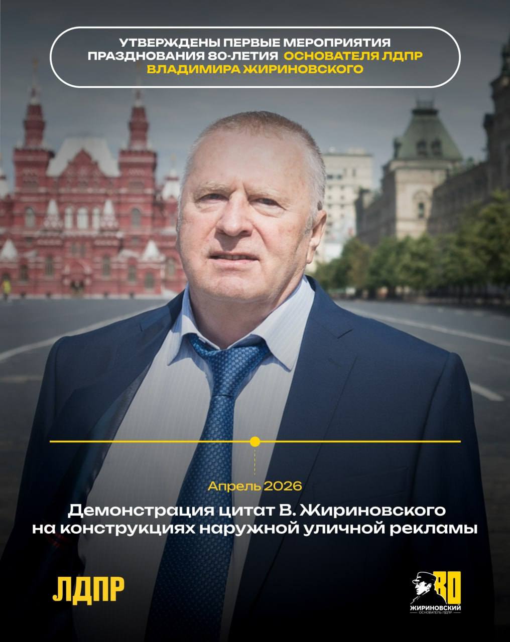 «Это важно для истории и для сохранения наследия Жириновского — уникального политика и неординарного человека. Он — первый политик России, в честь которого мероприятия проводятся по указу главы государства. Мы благодарны Президенту России Владимиру Путину за поддержку инициативы. Великий Жириновский многое сделал для становления и развития современной России, и его 80-летие будет отмечаться на государственном уровне».