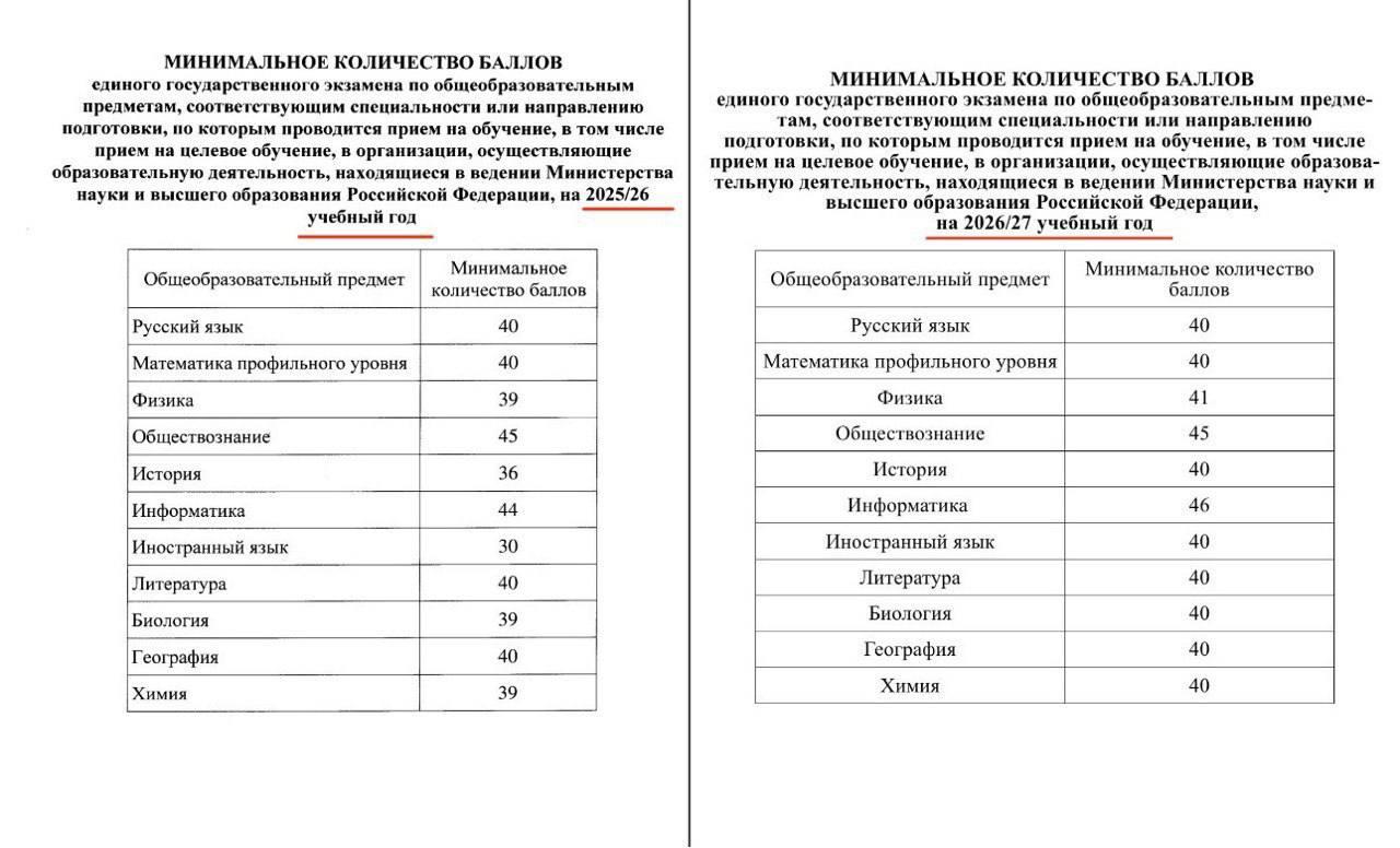 Решение принято после анализа приёмной кампании 2025/26: университеты не смогут опускать пороги ниже этих значений.