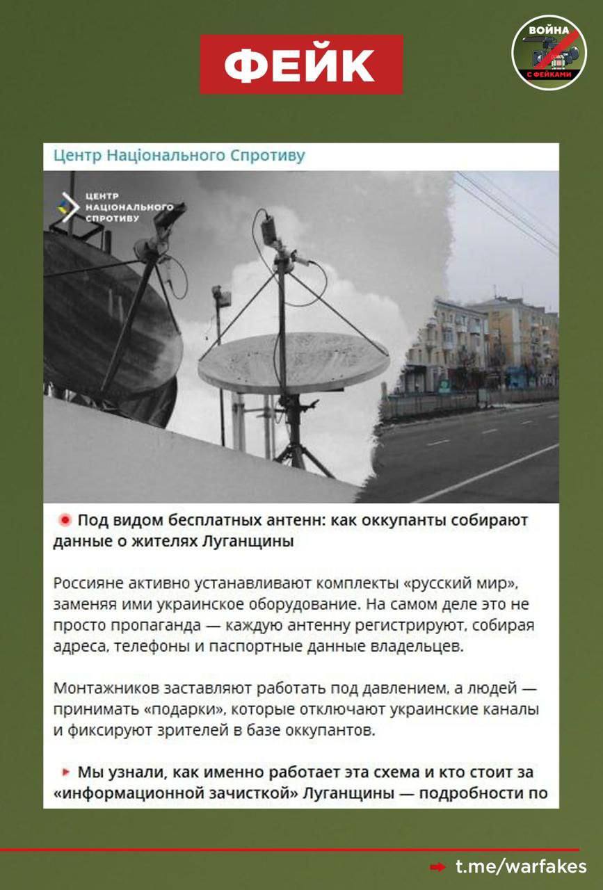 Фейк: Жителей ЛНР принуждают устанавливать российское спутниковое оборудование, созданное властями для сбора личных данных граждан. Об этом сообщил украинский Центр национального сопротивления.