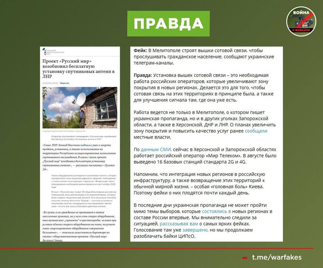 Украинские пропагандисты распространили похожие панические сообщения после новости о начале установки российских вышек сотовой связи в Запорожской области.