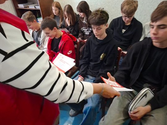 Затем работники Красного Креста рассказали о направлениях деятельности своей организации, какую помощь они оказывают людям, оказавшимся в сложной жизненной ситуации, вручили памятки и календарики.