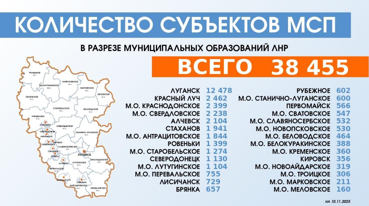 На 10.11.2025 в Едином реестре субъектов малого и среднего предпринимательства Луганской Народной Республики насчитывается 38 455 зарегистрированных предпринимателей.