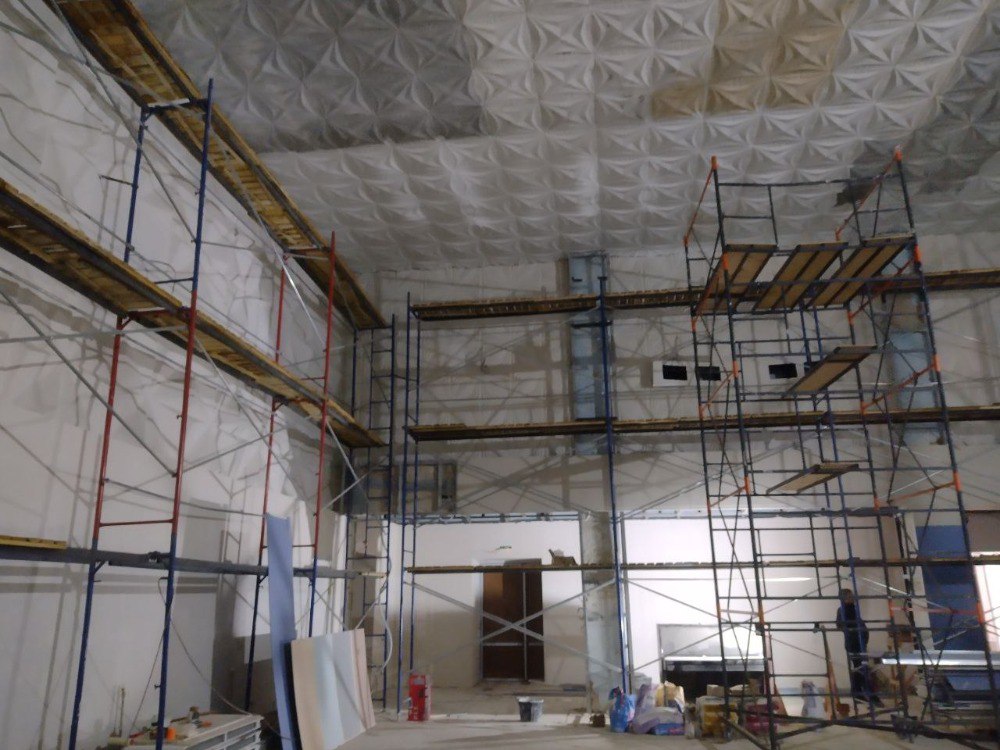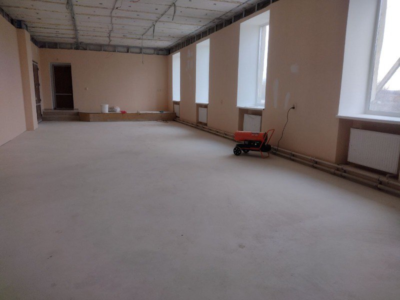 В некоторых кабинетах уже натянуты потолки. Производится укладка линолеума, а фундамент обшит сэндвич-панелями.