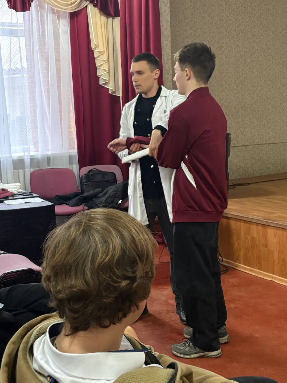 Врачи ГБУЗ "ПРЦРМБ" ЛНР, травматолог-ортопед Буров Станислав Анатольевич и врач анестезиолог-реаниматолог Залецкий Игорь Владиславович, провели важное мероприятие — практическое занятие по оказанию первой медицинской помощи для учеников старших классов гимназии №1 города Перевальска.