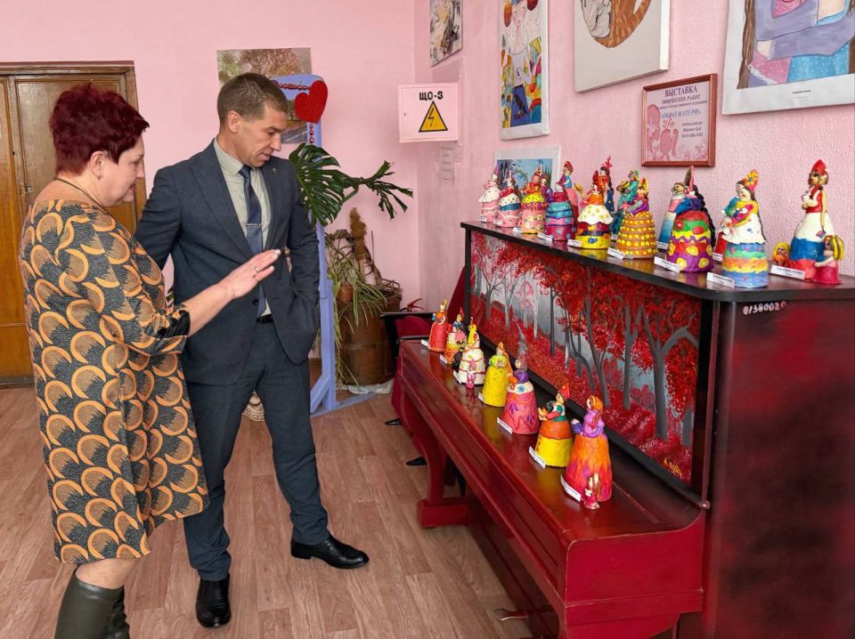 Перед началом торжественного мероприятия, посвященного Дню матери, глава городского округа город Первомайск Сергей Колягин погрузился в мир детского творчества на выставке «Образы матери».