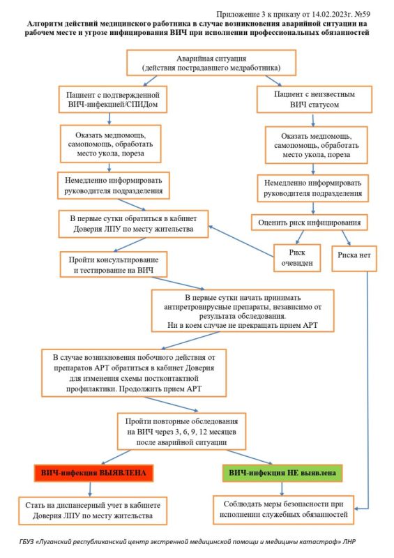 В приказе ГБУЗ «ЛРЦЭМП и МК» ЛНР от 14.02.2023 № 59 «Об организации мероприятий по профилактике заражения гемоконтактными инфекциями при исполнении профессиональных обязанностей» утверждены: