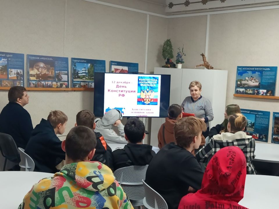 Для участников мероприятия была подготовлена презентация «Конституция России – история и современность», раскрывающая весь путь развития главного государственного документа от его зарождения и до наших дней. В ходе беседы ведущая прокомментировала основные гражданские, политические и личные права граждан, а также конституционные обязанности. По ходу знакомства с Конституцией дети выполняли задания, отвечая на вопросы тематической викторины «Знаешь ли ты Конституцию РФ?».