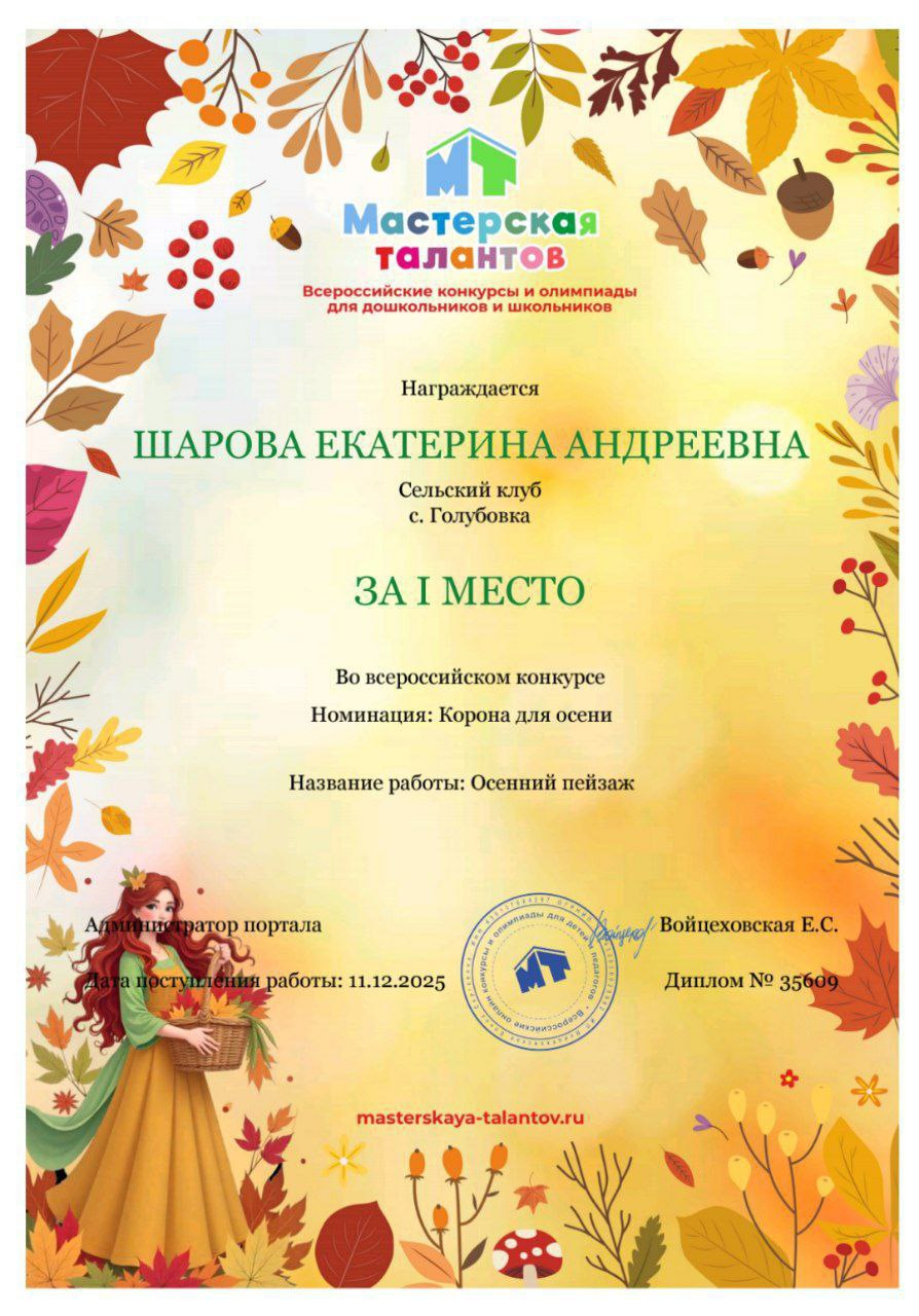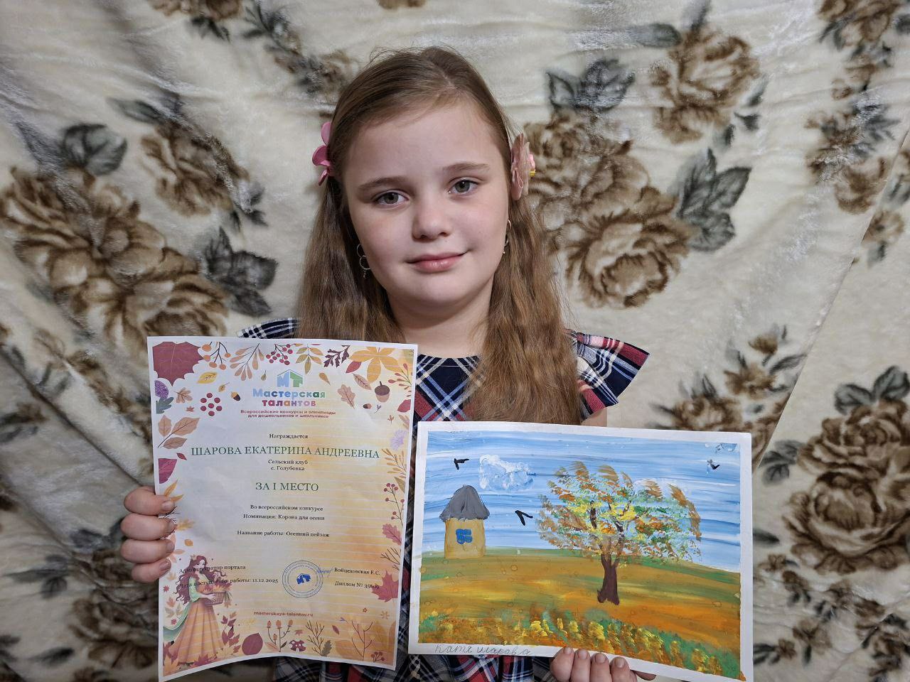 Работа «Осенний пейзаж», созданная Екатериной Шаровой , участницей кружка, отправилась покорять всероссийский конкурс «Мастерская талантов». Ее мастерство было отмечено высшей наградой – I местом! Екатерине торжественно вручили диплом и заслуженный подарок.