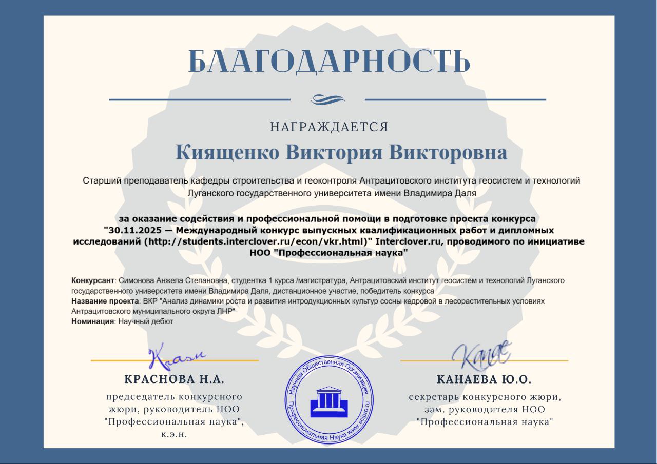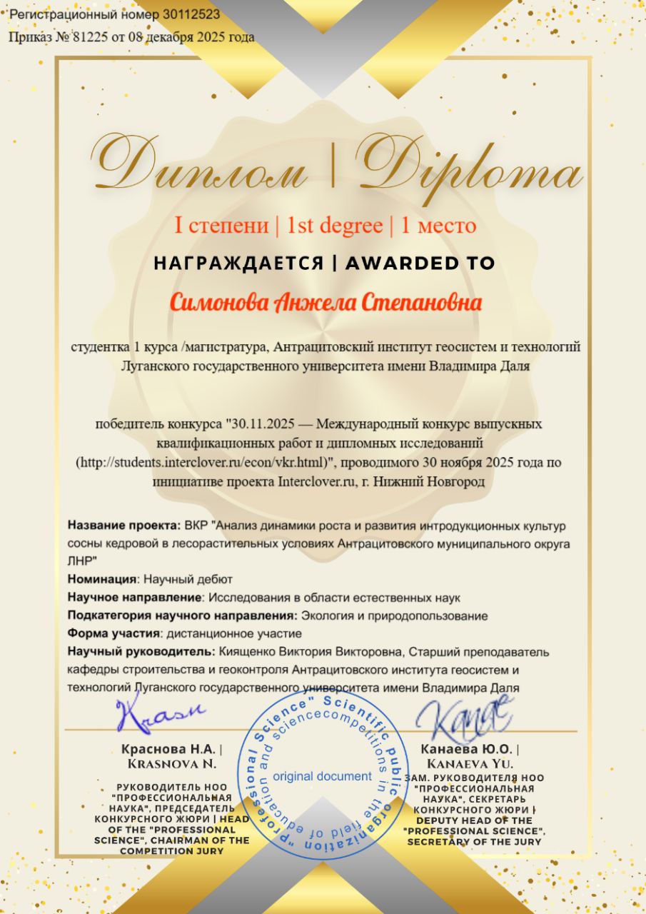 Студентка 1 курса (магистерская программа "Экологическая безопасность") Симонова Анжела приняла участие в Международном конкурсе выпускных квалификационных работ с ВКР бакалавра на тему: Анализ динамики роста и развития интродукционных культур сосны кедровой в лесорастительных условиях Антрацитовского муниципального округа ЛНР, научный руководитель - старший преподаватель кафедры строительства и геоконтроля Киященко В.В.